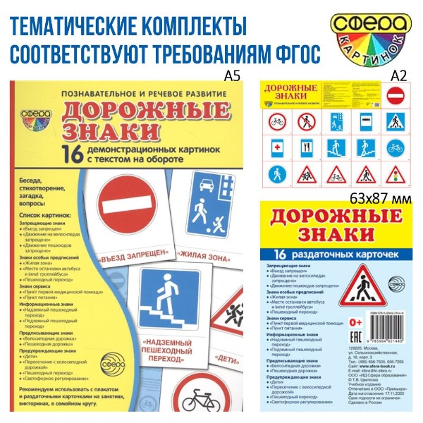 Ознакомить ребенка с основами безопасности на дороге поможет комплект «Дорожные знаки». В наглядной форме родители и педагоги вместе с ребенком изучат запрещающие и предписывающие знаки, знаки сервиса, знаки особых предписаний, предупреждающие знаки. С помощью карточек ребенок не только зрительно запомнит знаки, но и прослушает или выучит наизусть стихотворения про них.