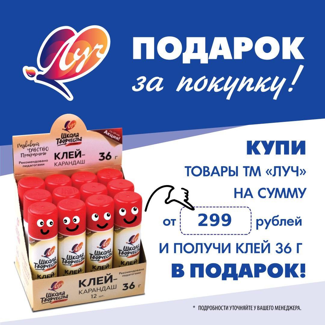 Купите товары ТМ «Луч» на сумму от 299 рублей и получите полезный подарок для творческого процесса — клей-карандаш!