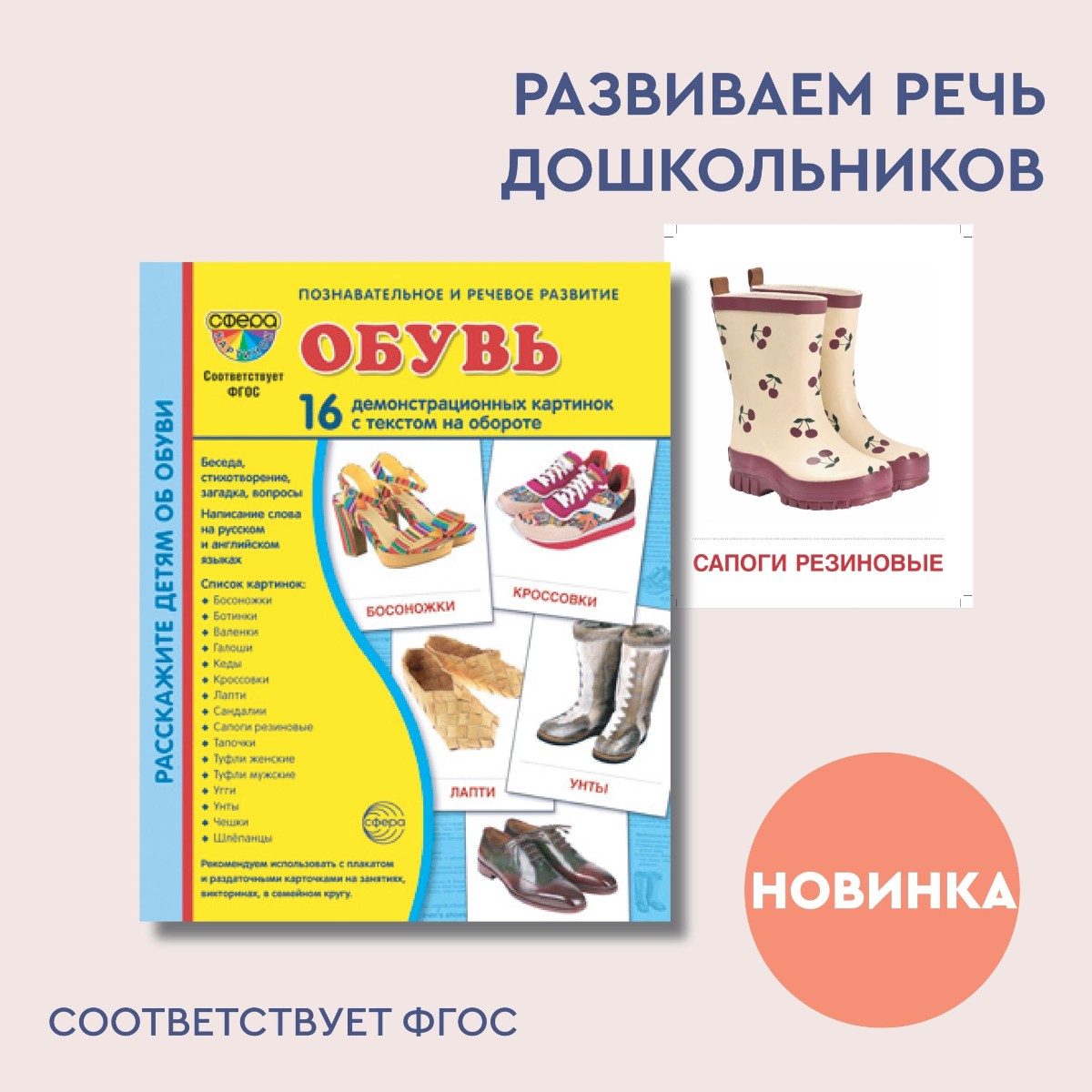 Демонстрационный комплект «Обувь» из серии «Сфера картинок» соответствует ФГОС и рекомендуется применять педагогам с плакатом и раздаточными карточками.