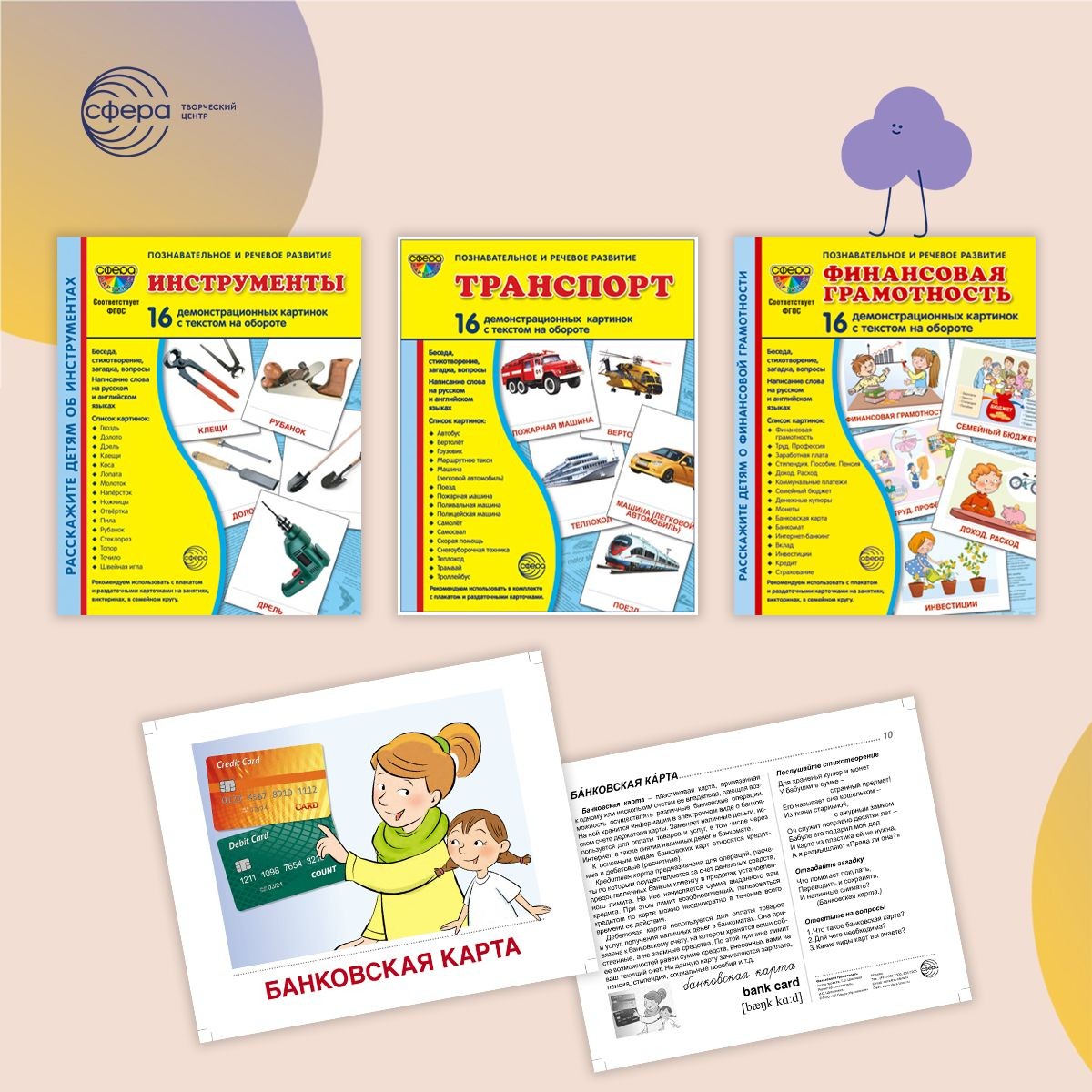 Серия «Сфера картинок» — универсальные наглядные пособия издательства «Творческий Центр Сфера», охватывающие 50 тем. Тематические комплекты соответствуют требованиям ФГОС и содержат 16 иллюстраций с текстом на обратной стороне.