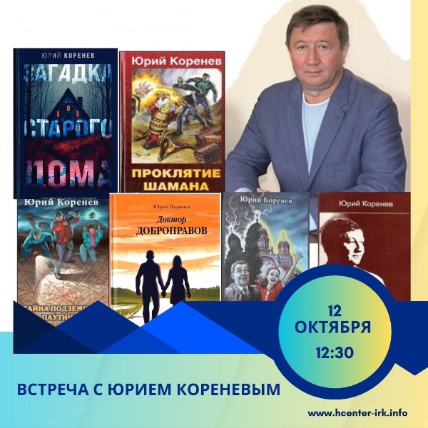 12 октября в 12:30 в читальном зале Гуманитарного центра-библиотеки имени семьи Полевых состоится творческая встреча с прозаиком, кандидатом медицинских наук, депутатом Думы города Иркутска, членом Союза писателей России Юрием Кореневым.