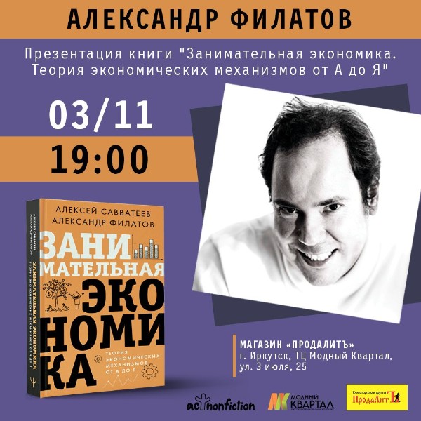 3 ноября приглашаем на встречу с одним из авторов книги "Занимательная экономика. Теория экономических механизмов от А до Я" Александром Филатовым.