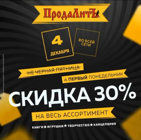 А это значит, что 4 ДЕКАБРЯ действует скидка 30% во всех магазинах ПродаЛитЪ!