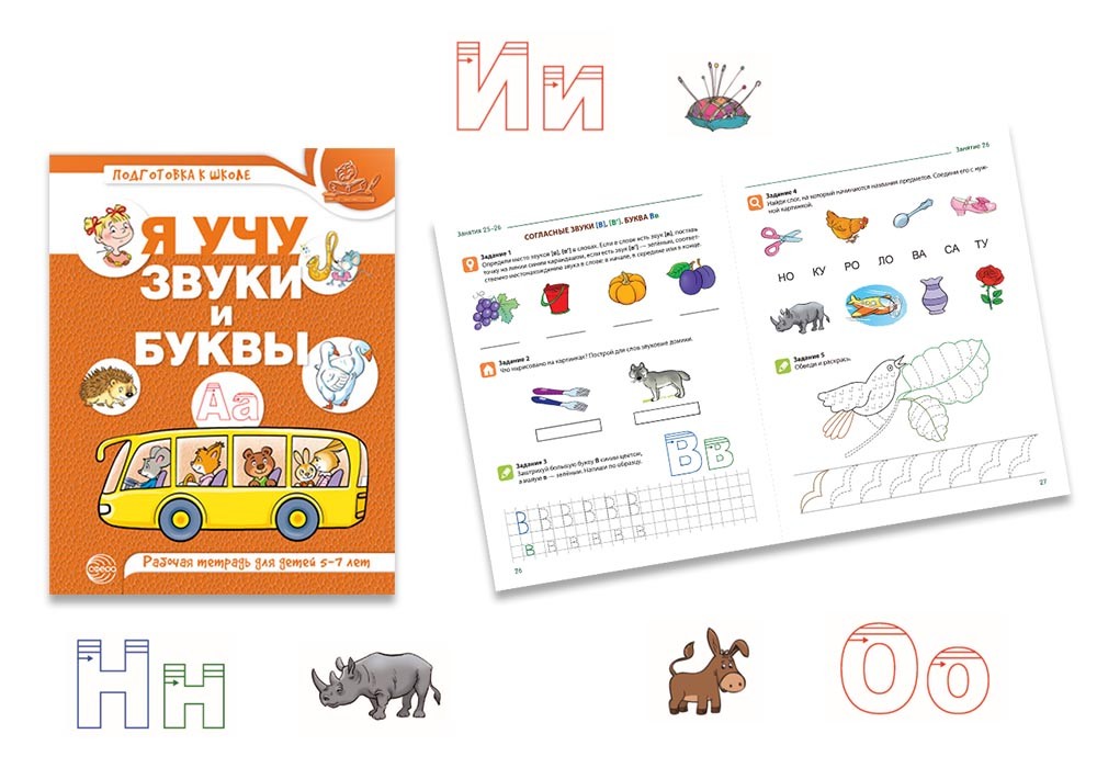 Для отработки навыков написания печатных букв приведены прописи — ребенку предлагается освоить написание каждой буквы, ориентируясь на ее пунктирные контуры. Выполняя упражнения в рабочей тетради, ребенок научится проводить звуковой анализ слов, сравнивать слова по звучанию и смыслу, подбирать слова на заданный звук и научится чтению слогов.