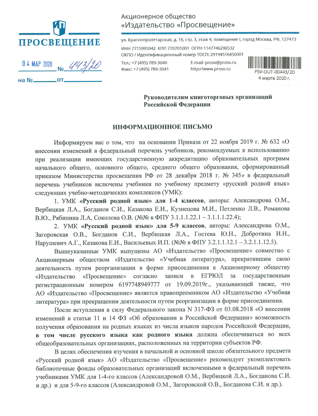 Информационное письмо от "Просвещения"