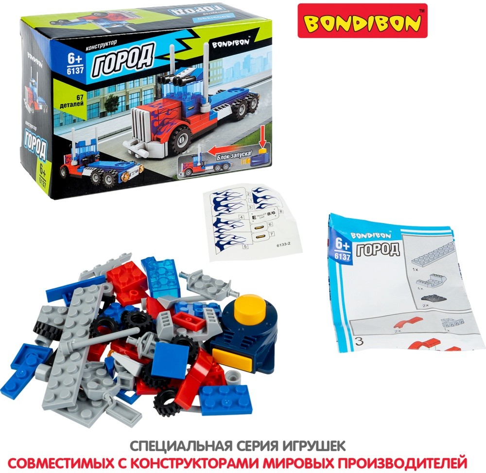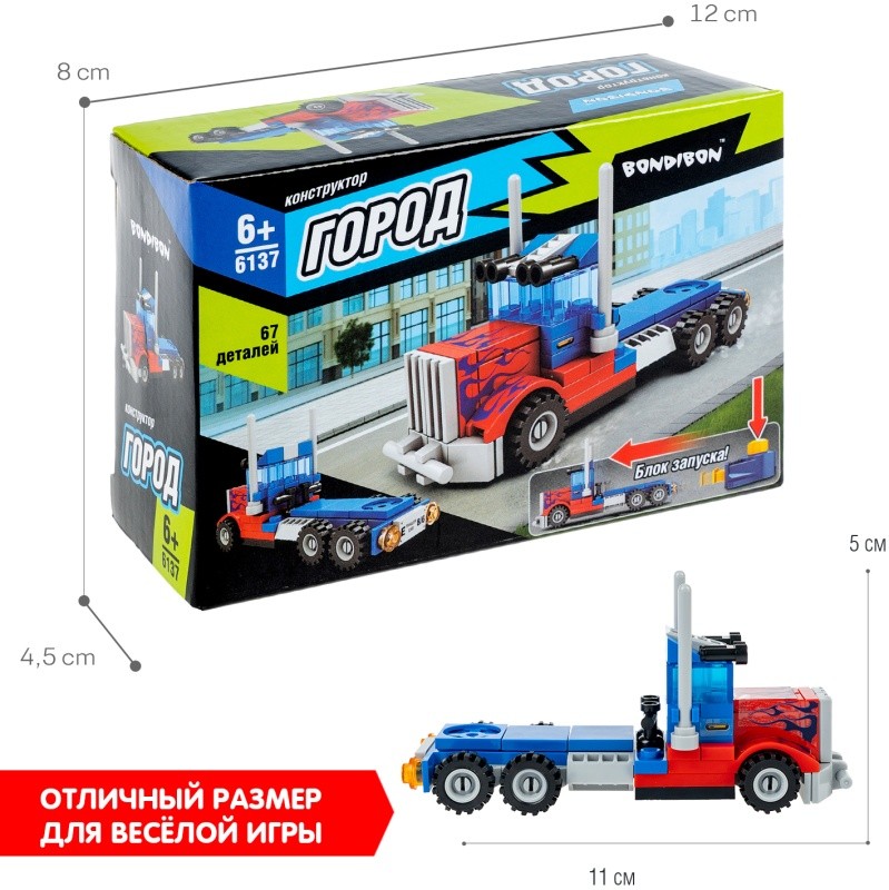 Конструктор сине-красный ГРУЗОВИК с блоком запуска из коллекции ГОРОД от Bondibon – замечательный подарок для мальчика. Самостоятельно соберите синюю с красным модель тягача из 67 деталей и приведите ее в движение. Придумывайте захватывающие сюжеты и наслаждайтесь игрой! Соберите игрушку, следуя подробной инструкции. Детям очень нравятся качественные детали из безопасной пластмассы, которые легко и надежно соединяются друг с другом. Немного усердия и грузовик готов! Состыкуйте сборную модель с блоком запуска и нажмите кнопку на нем, чтобы машинка поехала вперед. Яркий ГРУЗОВИК от Бондибон поможет развить у ребенка интерес к конструированию, моделированию, мелкую моторику, концентрацию внимания, эмоциональный интеллект, фантазию, логическое и пространственное мышление. Детали игрушки совместимы с деталями конструкторов мировых производителей. В набор входят: 67 деталей для сборки, блок запуска, инструкция. Возраст 6+