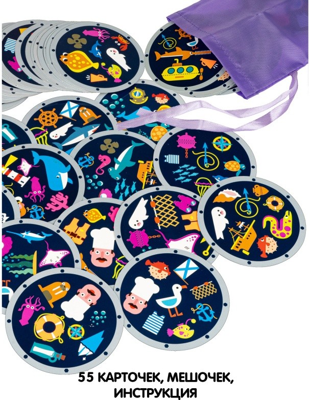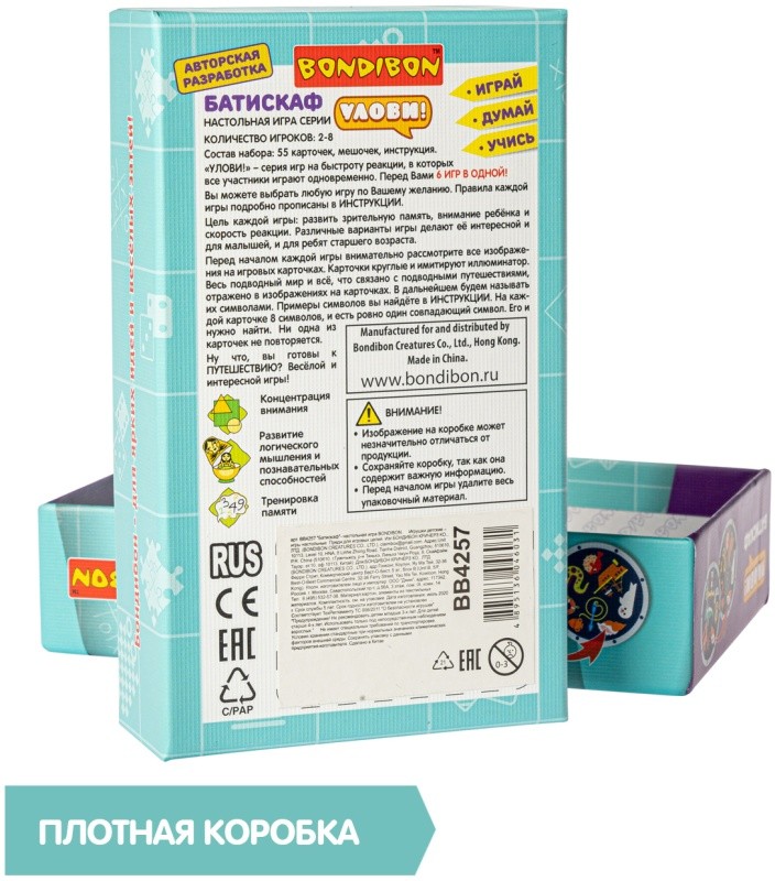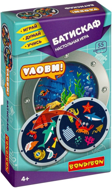 Совершите увлекательное подводное путешествие не выходя из дома с настольной игрой УЛОВИ! БАТИСКАФ 6 в 1 от Bondibon. Авторская разработка серии Играй Думай Учись – отличный способ развить концентрацию внимания и быстроту реакции детей. Выберите любую из шести игр по Вашему желанию. Следуйте простым правилам из инструкции. Внимательно рассмотрите все изображения на карточках и найдите совпадающий символ. В процессе игры ребенок получит массу положительных эмоций, расширит кругозор, разовьет зрительную память, логическое мышление и познавательные способности. В набор входят: 55 карточек, инструкция, тканевый мешочек. Количество игроков 2-8 Возраст 4+ Соберите коллекцию развивающих игр серии Играй Думай Учись от Бондибон!