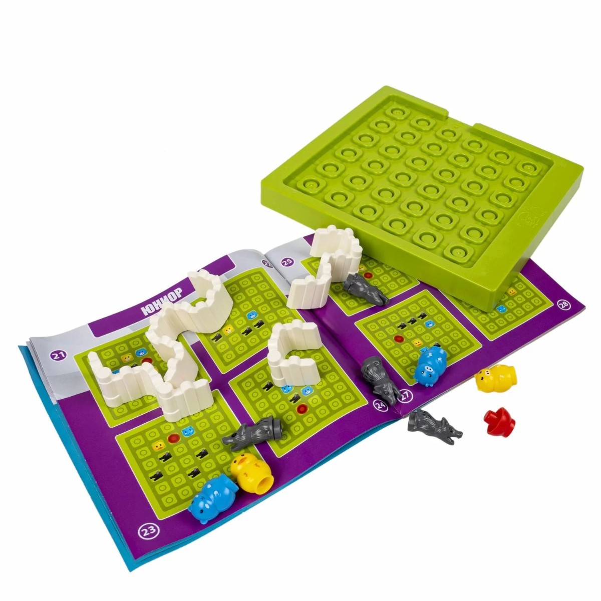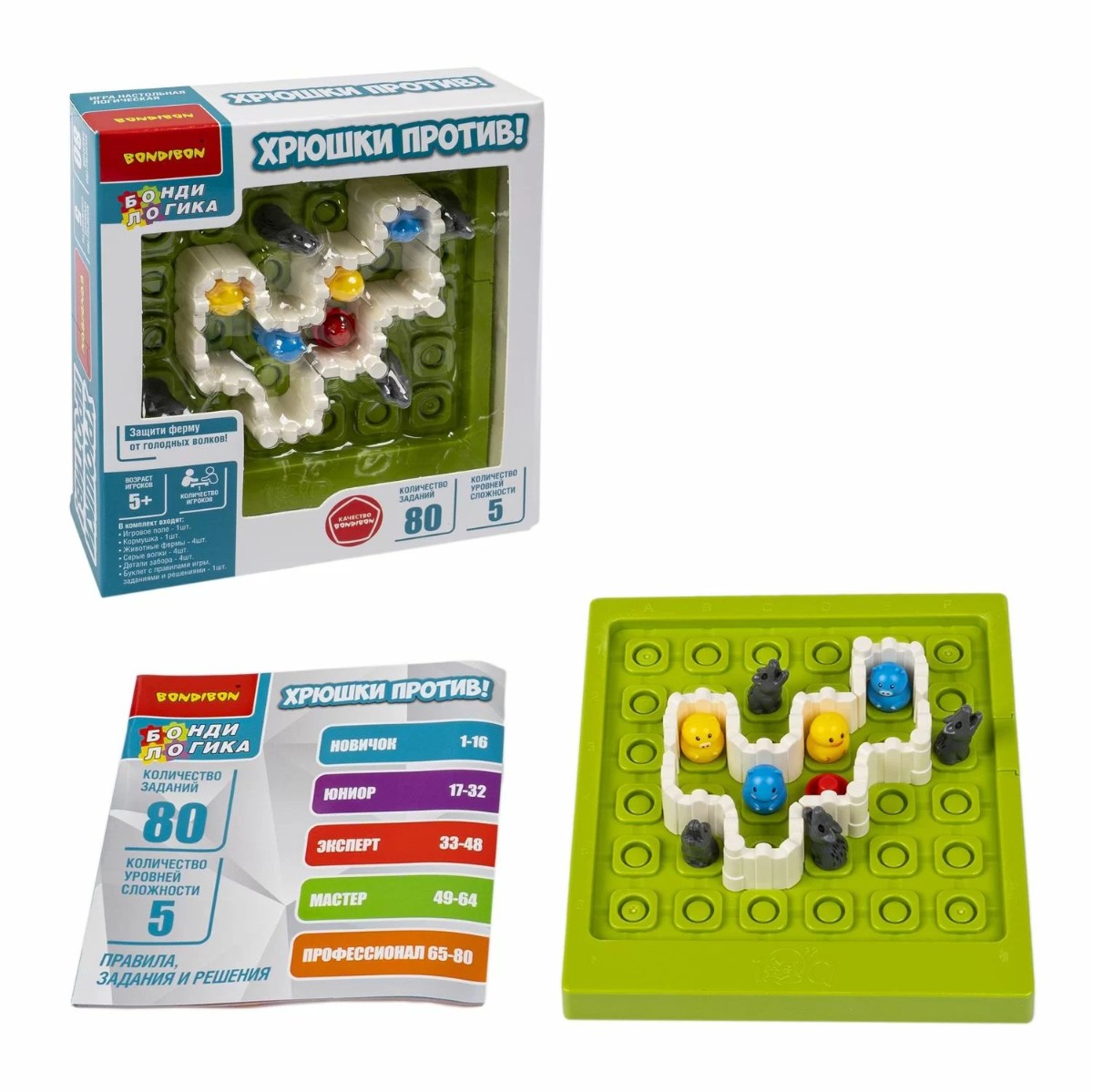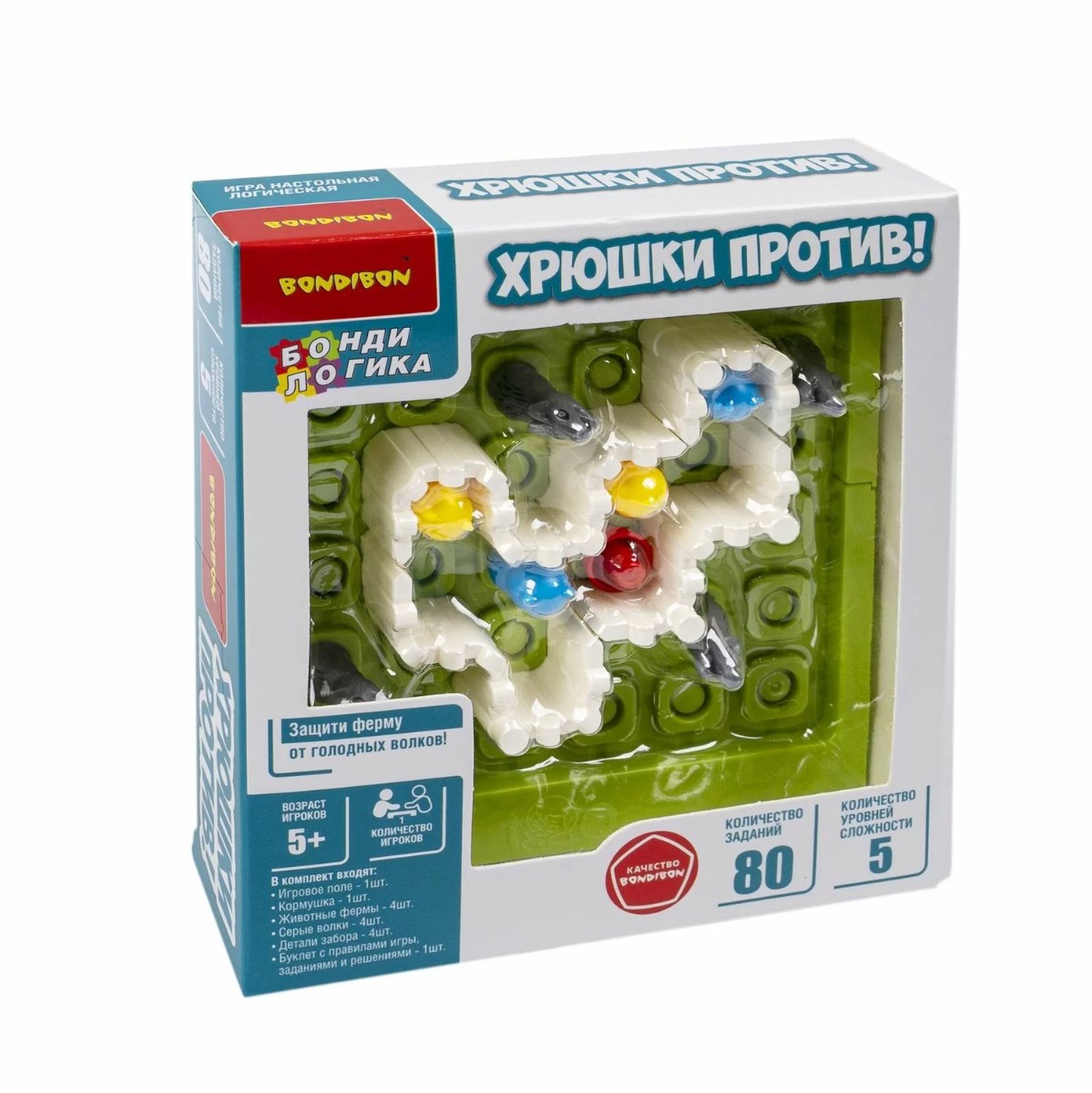 Головоломка в виде фермы с цветными фишками-зверюшками увлечет детей на долгие часы! Настольная логическая игра ХРЮШКИ ПРОТИВ! серии БондиЛогика от Bondibon содержит 80 заданий от простых с подсказками до суперсложных. Выберите задание и установите фигурки животных и кормушку на игровое поле, как показано на картинке. Ваша задача – расположить детали забора так, чтобы отделить обитателей фермы и кормушку от волков. Поросенок, другие животные фермы и кормушка должны быть огорожены со всех сторон. Зоны безопасности могут быть разного размера и располагаться отдельно друг от друга. Волки не должны быть со всех сторон огорожены заборами, хотя бы одна сторона всегда должна оставаться открытой. Игра ХРЮШКИ ПРОТИВ! от Бондибон - отличный подарок, который поможет развить логику, пространственное мышление и внимание. В набор входят: игровое поле, кормушка, 4 животных фермы (свинка, цыпленок, бычок, хомяк), 4 волка, 4 детали забора, буклет. Количество игроков 1 5 уровней сложности Возраст 5+