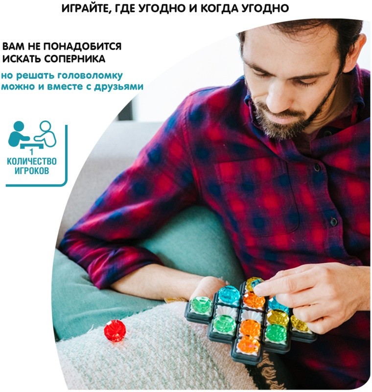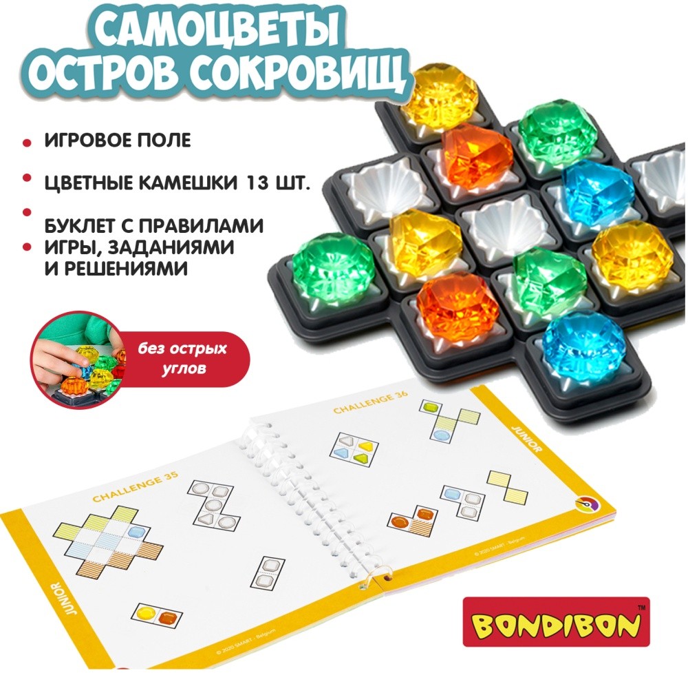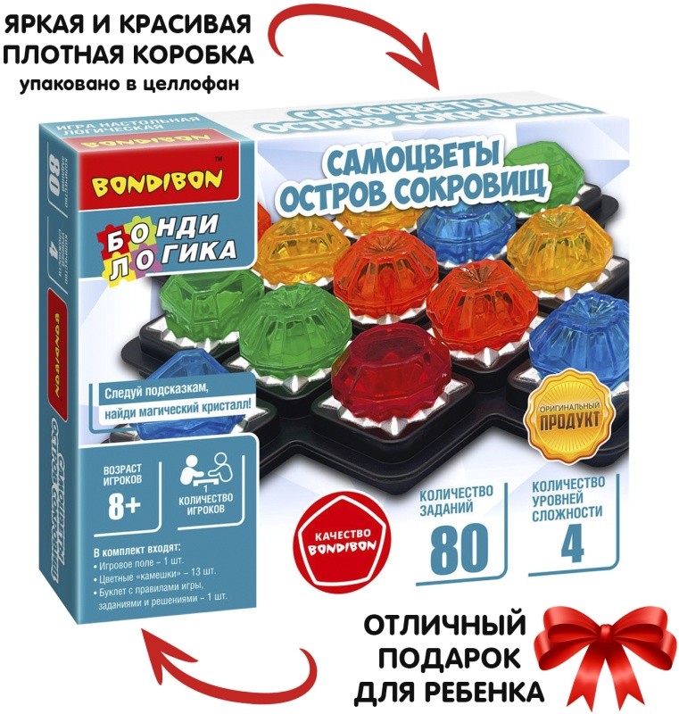 Настольная логическая игра САМОЦВЕТЫ. ОСТРОВ СОКРОВИЩ от Bondibon придется по вкусу детям, которые обожают приключения и интеллектуальные задачки. Порадуйте ребенка замечательной красочной головоломкой серии БондиЛогика! Выберите одно из 80 заданий. Помните, каждый камешек уникален! Используйте подсказки из задания, располагая все цветные кристаллы на игровом поле. Позиции некоторых камней не указаны, но они вычисляются логически. Узнайте, где спрятан красный кристалл! Найдите единственное верное решение. Постепенно переходите на более сложные уровни. Увлекательная игра от Бондибон способствует развитию зрительно-моторной координации движений, познавательных способностей, концентрации внимания, логического мышления и эмоционального интеллекта. Оригинальная головоломка – отличный подарок не только для детей, но и для взрослых. В набор входят: игровое поле, 13 цветных камешков, буклет с правилами игры, заданиями и решениями. 4 уровня сложности Возраст 8+ Количество игроков 1