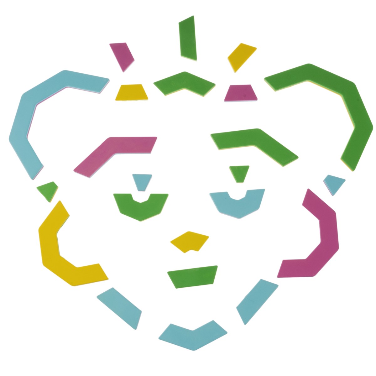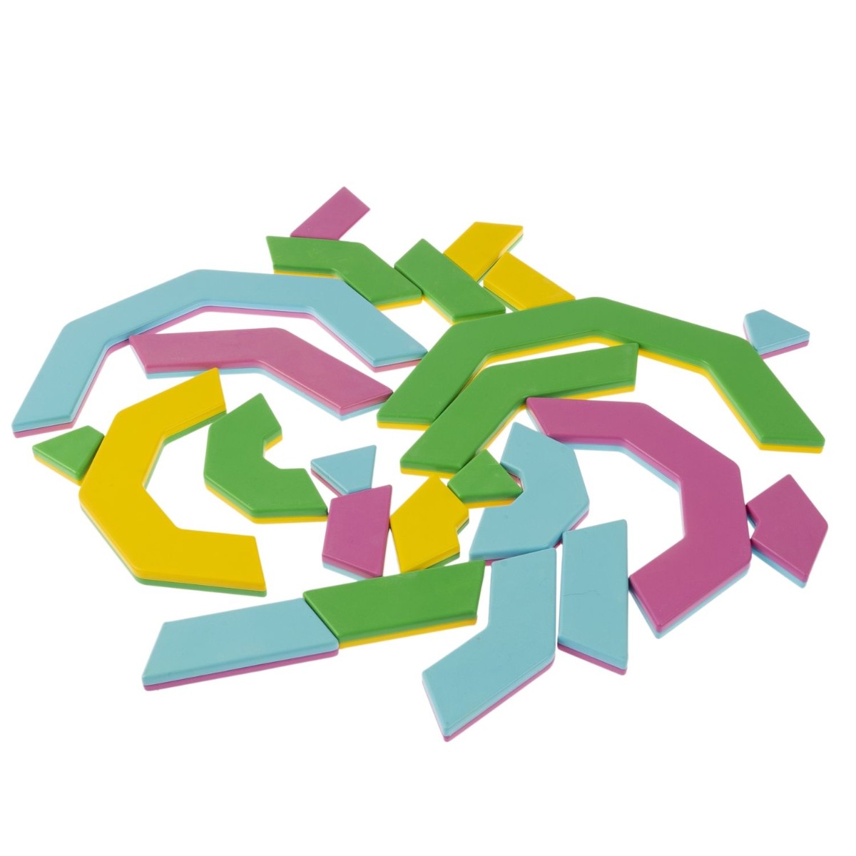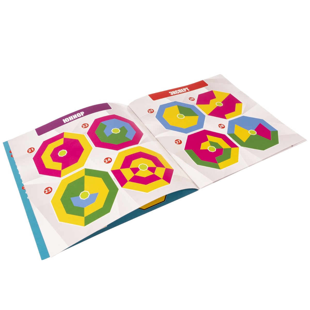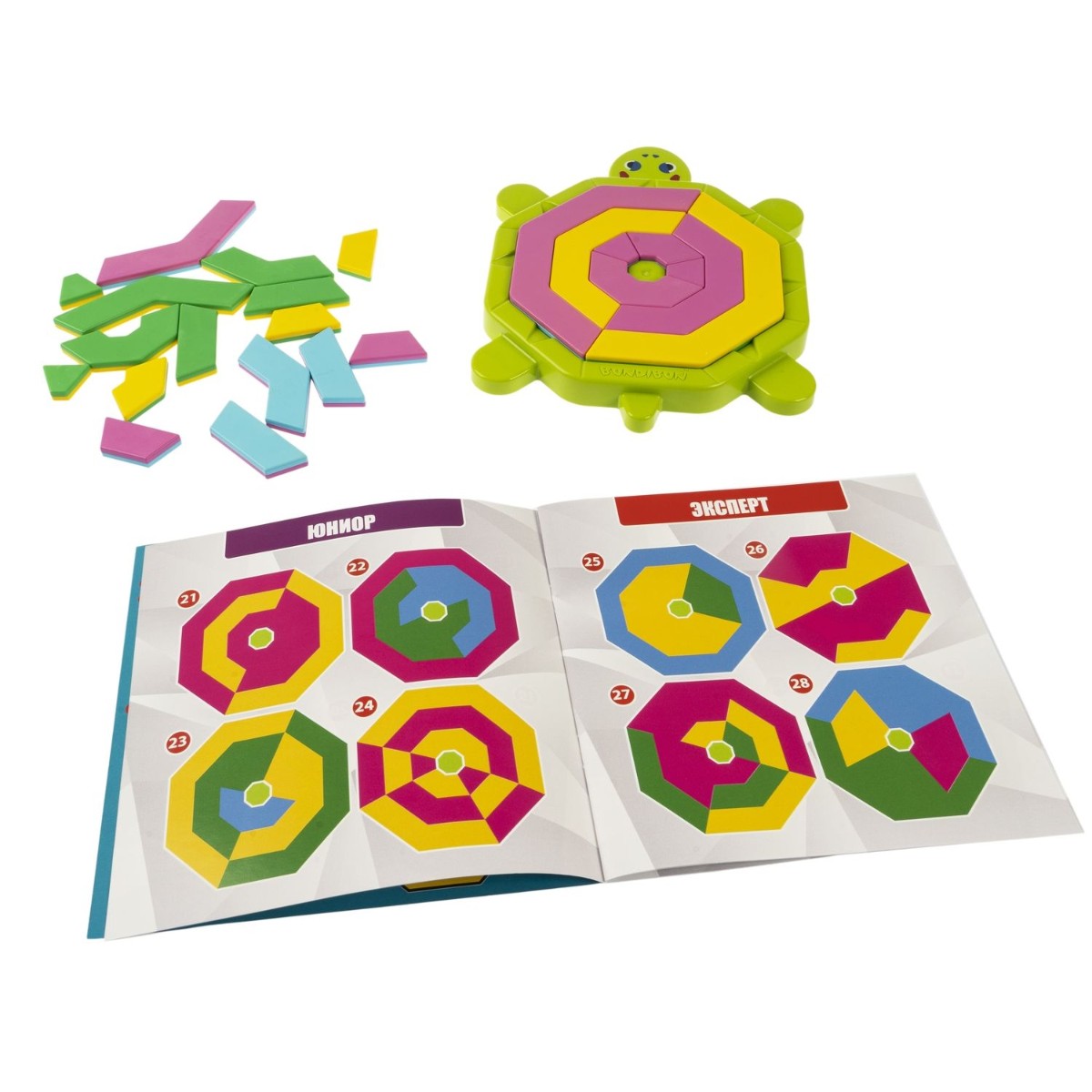 В комплекте: игровое поле в виде черепашки, 2 комплекта двухслойных двухцветных деталей для панциря разной формы, буклет с 48 заданиями и 4 уровнями сложности.