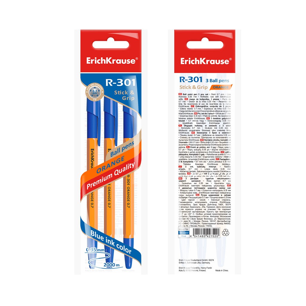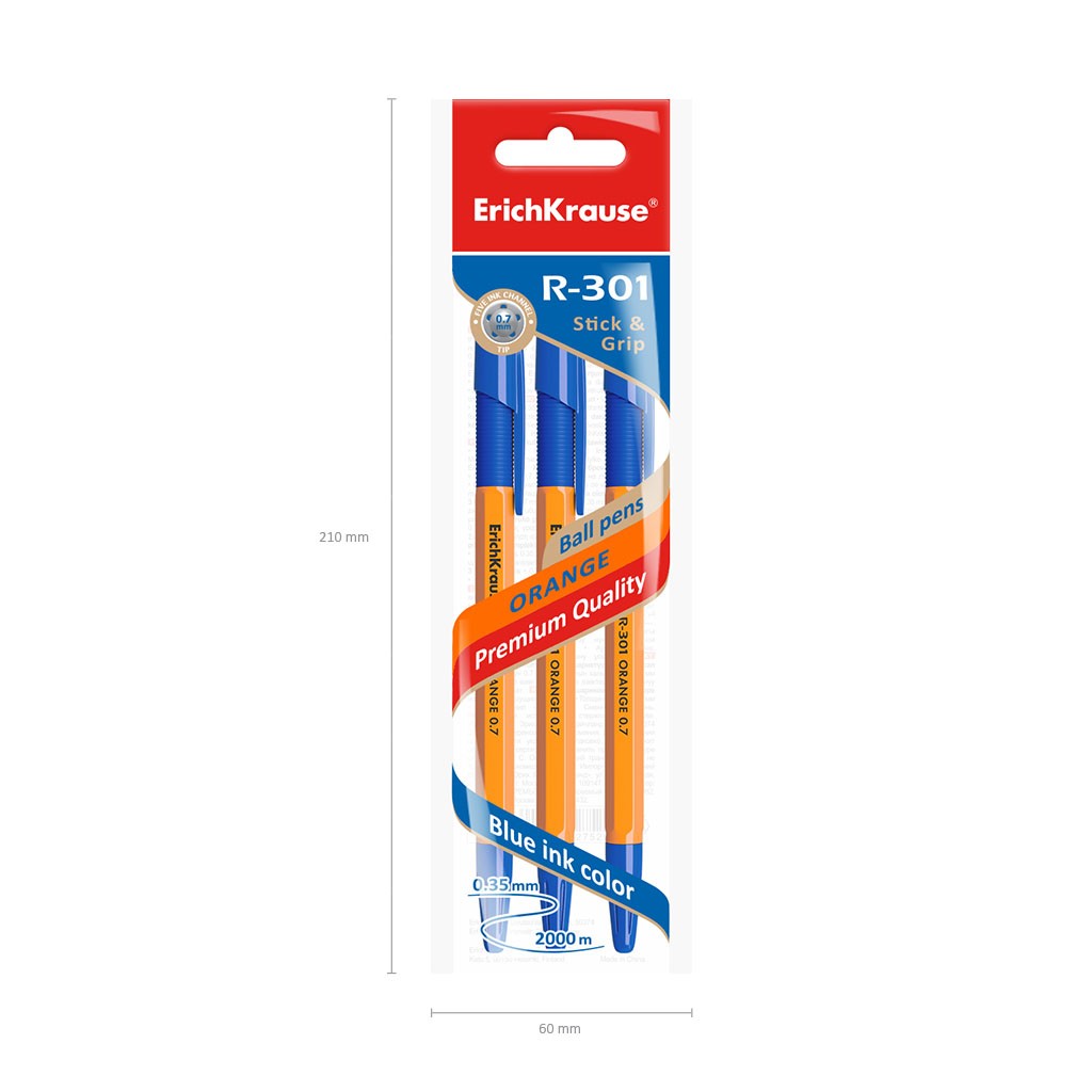 Ручка шариковая синяя EK R-301 Orange Stick&Grip оранжевый корпус