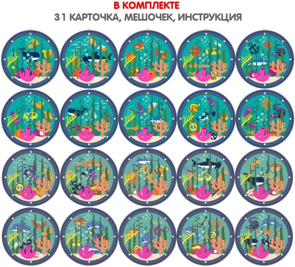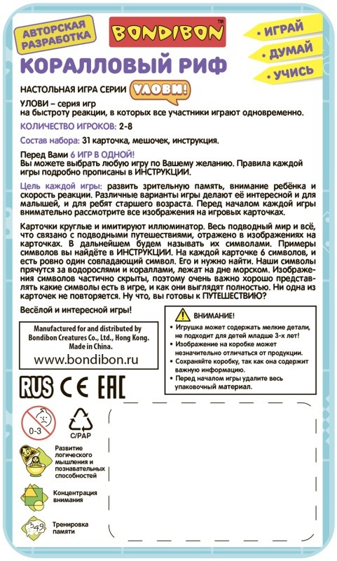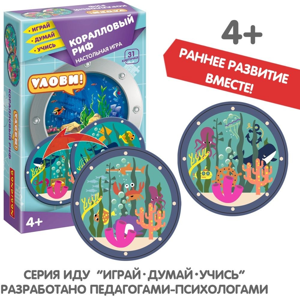 Настольная игра УЛОВИ Коралловый риф 6в1 серии Играй Думай Учись от Bondibon – прекрасный способ погрузиться на дно океана, не покидая пределов собственной комнаты! Поместите одну карточку-иллюминатор в центр игрового поля, остальные разложите картинками вверх. Внимательно изучите изображения в иллюминаторе, найдите карточку, среди изображений которой есть символ из первой карточки. Игрок, первым определивший пары карт с совпадающими символами, забирает их себе. Побеждает участник, набравший максимальное количество карточек. Увлекательная игра от Бондибон развивает зрительное восприятие, внимание, скорость реакции, мелкую моторику, расширяет знания детей об окружающем мире. В набор входят: 31 карточка из твердого картона с изображениями, мешочек для хранения, инструкция с рекомендациями. Набор предоставляет возможность проведения 6 вариантов игр. Все детали изготовлены из качественных материалов, предусматривающих долговременное использование. Количество игроков 2-8 Возраст 4+