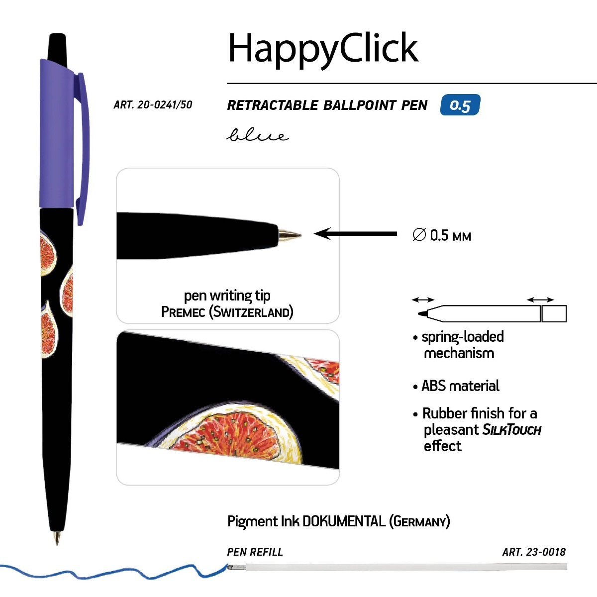 Яркие и сочные фрукты эффектно выделяются на черном фоне обложек общих тетрадей серии "JUICY LIFE". Оригинальные дизайны вдохновляют и поднимают настроение, что способствует отличной работоспособности и прекрасному усвоению материала. Тетради стандартного формата отлично подойдут для ведения учебных записей. Материал обложки - мелованный картон плотностью 190 г/кв.м, обложка прекрасно защищает блок от механических повреждений. Дополнительная отделка матовой пленкой SoftTouch предохраняет от воздействия влаги и придает приятный бархатистый эффект. Материал блока - белая офсетная бумага плотностью 70 г/кв.м является материалом для печати блока. Линовка блока - клетка с полями позволяет вести аккуратные записи, составлять таблицы и строить графики. Углы тетрадей скруглены. Крепление - 2 металлические скрепки. Титульный лист имеет линовку для подписи тетради. Тактильно приятная, имеющая надежный и простой нажимной механизм с бесперебойной подачей стержня, ручка "HappyClick" от Bruno Visconti станет неизменным помощником в учебе и работе.