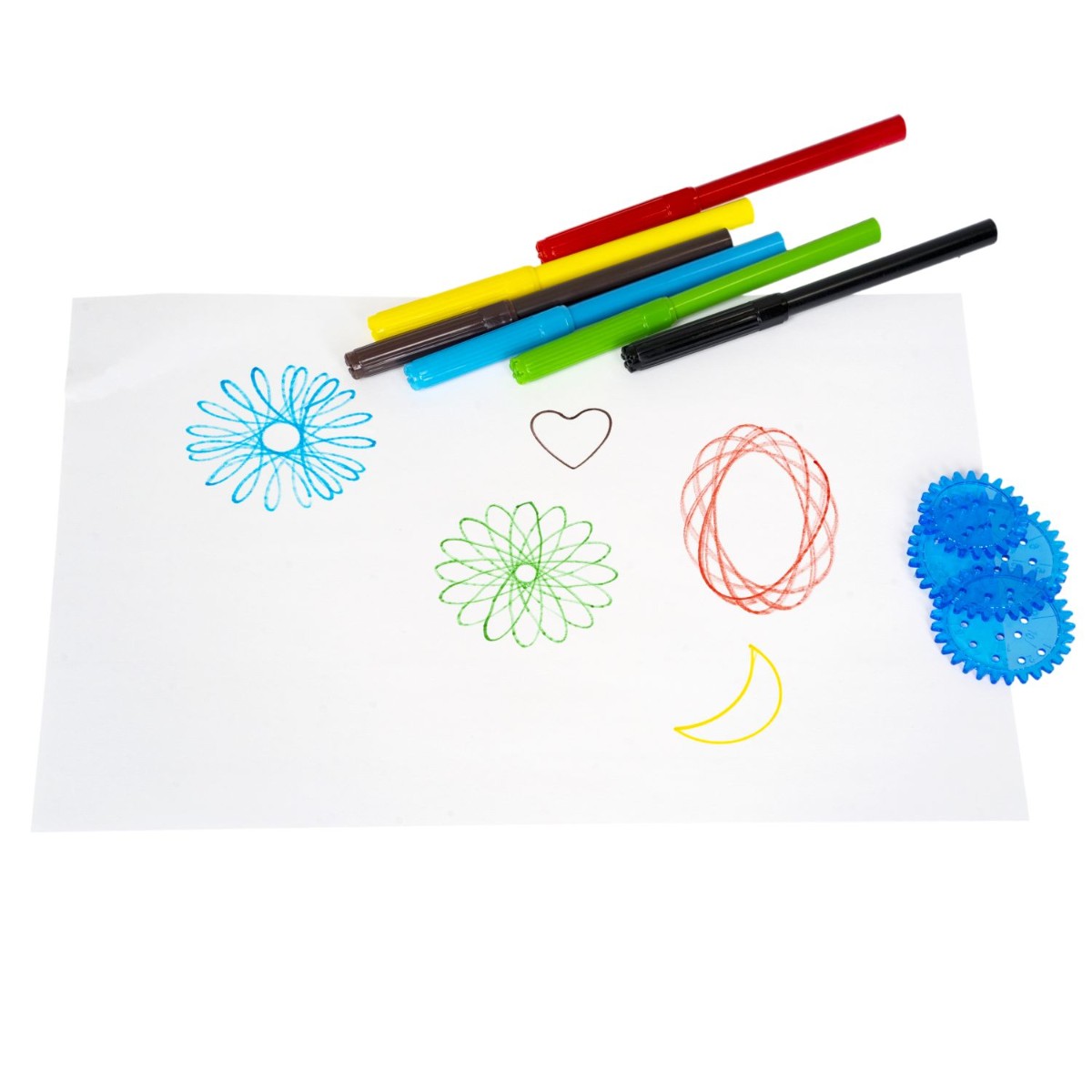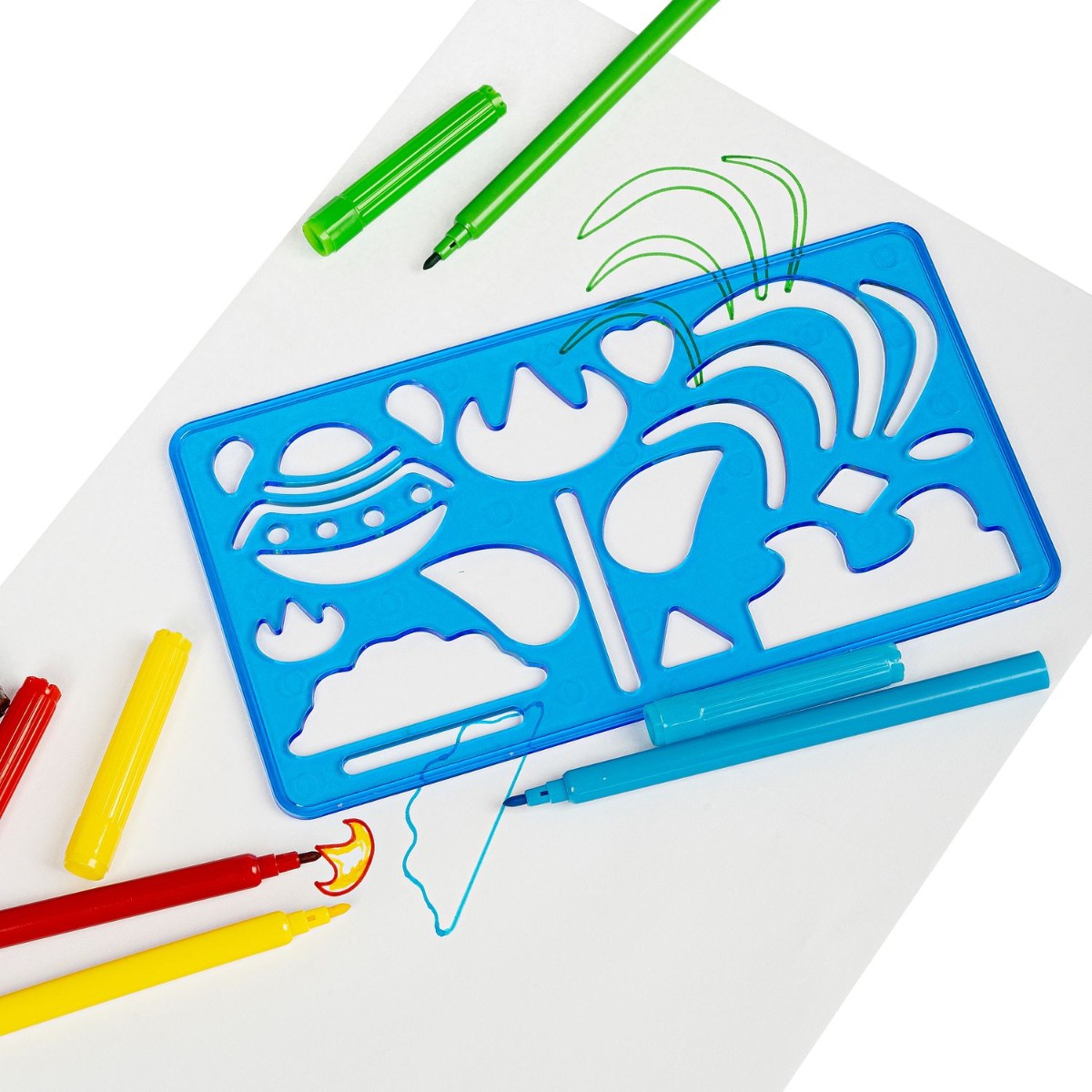 В комплект входят: фигурный вкладыш- 7шт., спирограф - 4шт., фломастеры- 6 шт., бумага для рисования- 6 шт., ручка - 1шт.