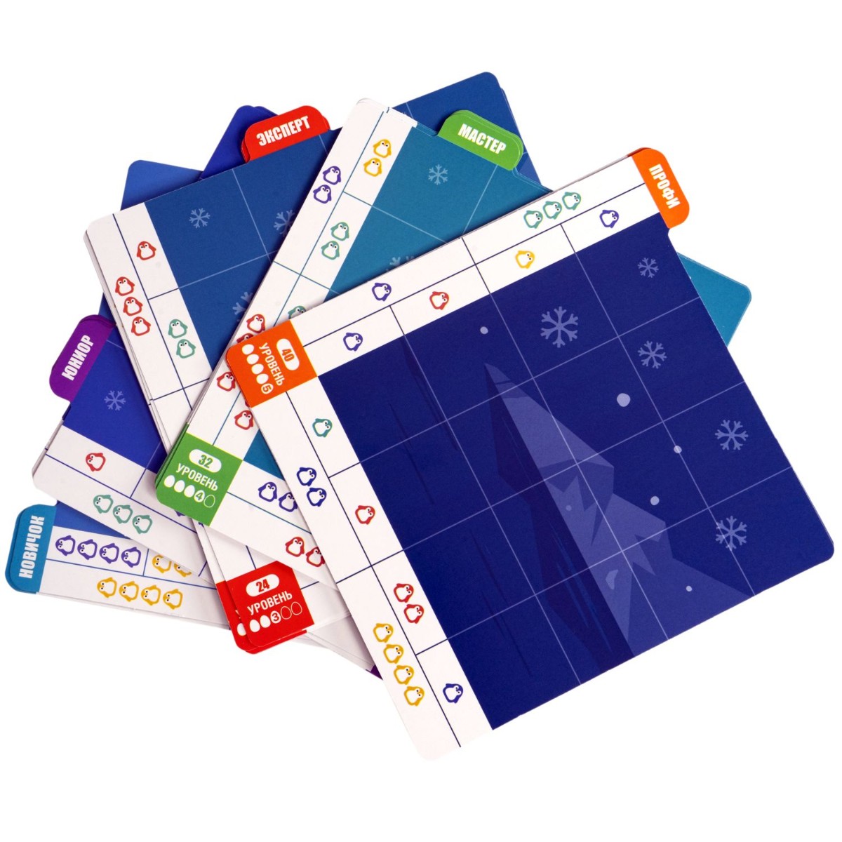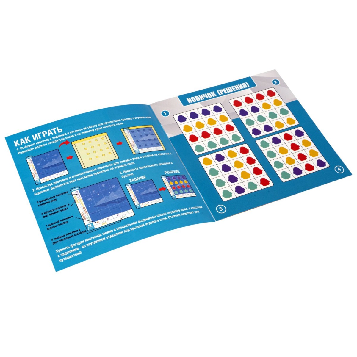 В комплекте: игровое поле, фигурки пингвинов 4 цветов – 16 шт., двухсторонние карточки с заданиями – 20шт, буклет с правилами игры и решениями. Для 1 игрока. 6+.