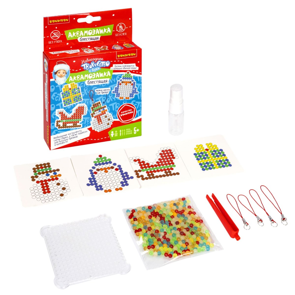 Сказочная атмосфера зимнего веселья и новогодних праздников! Новогодняя блестящая аквамозаика "СНЕГОВИК, ПОДАРОК, ПИНГВИН, САНИ" от Bondibon. Создание мозаики — это очень увлекательный процесс. Для того, чтобы собрать игрушку, ребенок задействует множество процессов: память, мышление, воображение, мелкую моторику маленьких пальчиков. Совместить приятное с полезным — что может быть лучше! Разложите цветные бусинки по трафарету, смочите их водой, дайте им высохнуть не менее 20 минут! После того, как фигурка застынет, прикрепите подвеску. Зимний брелок готов В комплекте: набор цветных бусин; пластиковая основа; распылитель воды; 4 карточки-трафарета; пинцет и подвески для брелоков. Возраст 5+ В преддверии Нового Года и Рождества, идея символов зимушки-зимы становится особо интересной. Желаем творческих успехов всем мальчикам и девочкам. Дарите подарки из серии Новогоднее творчество с Буки Bondibon и радуйте близких!