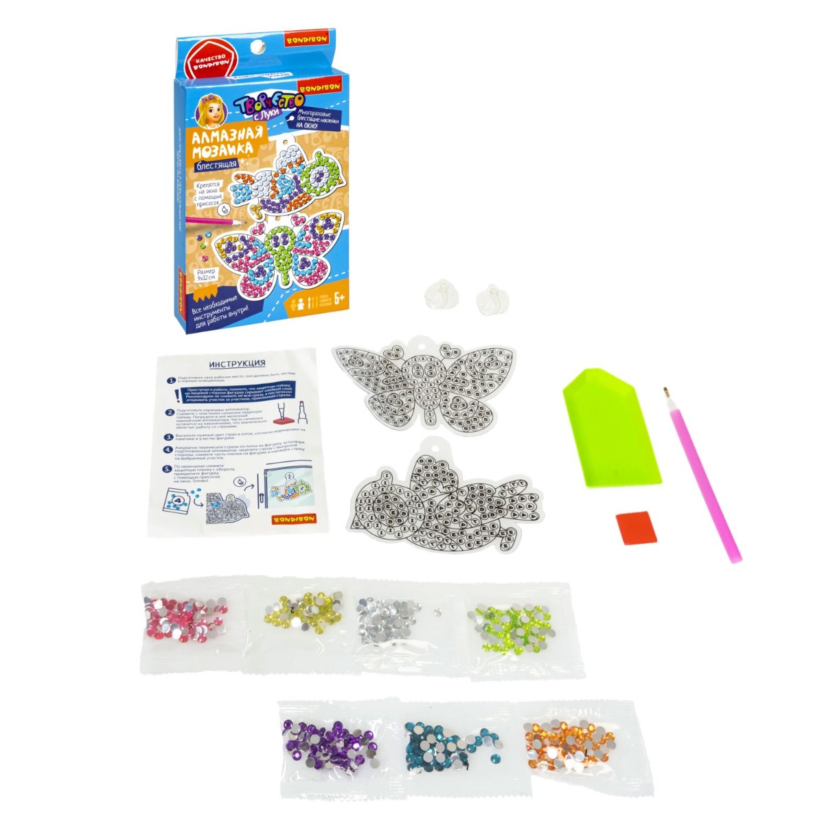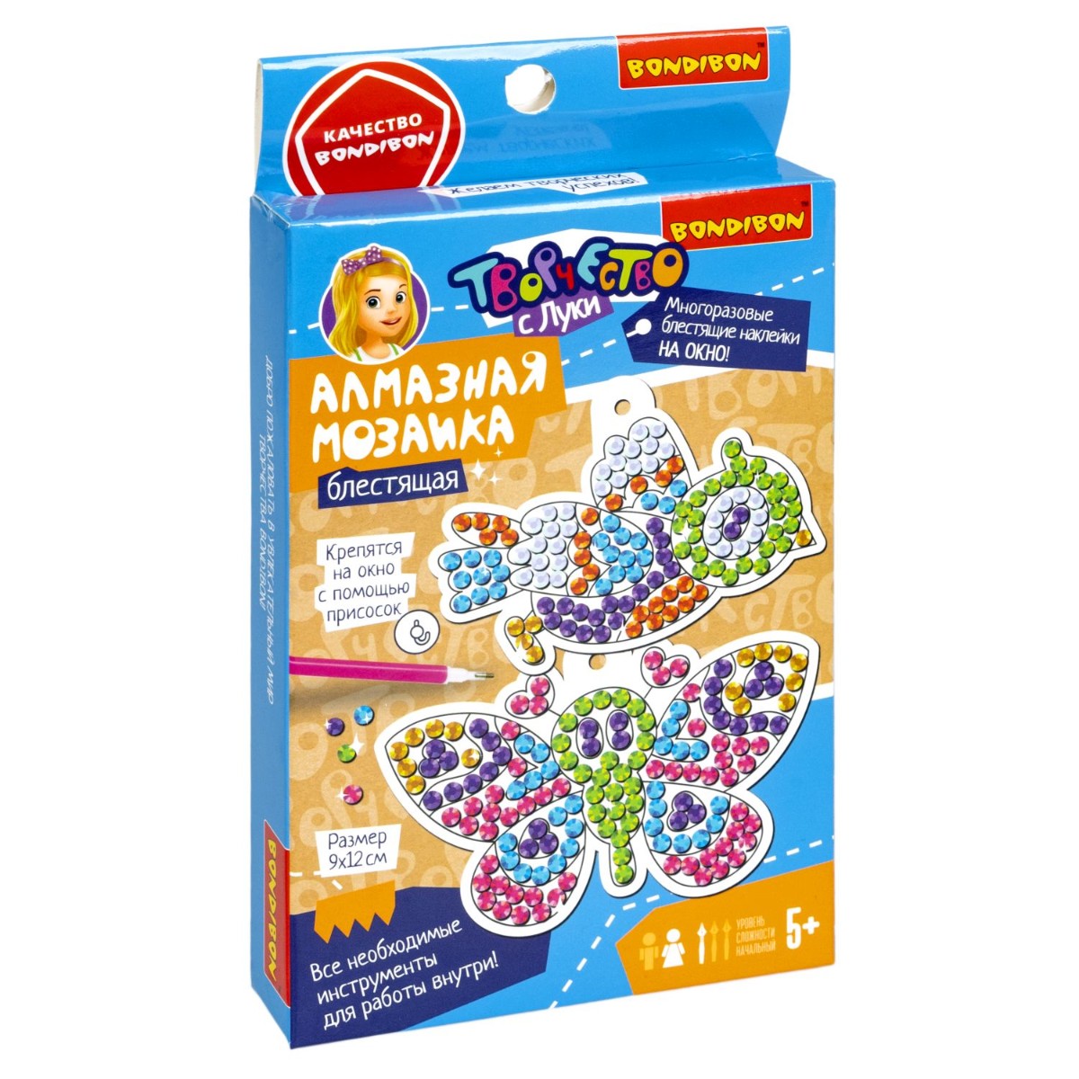 Алмазная мозаика "БАБОЧКА И ПТИЧКА" - уникальный сверкающий вид творчества! А еще эти многоразовые блестящие наклейки можно клеить на окно. Выкладывание страз прекрасно успокаивает, способствует снижению стресса, а также развивает мелкую моторику и цветовосприятие. Такое творчество привьет ребенку усидчивость и терпение, поможет развитию воображения. Перенесите стразы на основу, используя аппликатор: зацепите стразу с выпуклой стороны и на клейте на выбранный участок. У Вас получатся 2 крупных стикера (9х12 см) - милая птичка и нежная бабочка. Готовые наклейки прикрепите к стеклу с помощью присосок. В наборе для поделок 2 основы, присоски на стекло, многоразовый набор мозаики и инструментов. Превратите творческий процесс в настоящее волшебство. Оцените красочные переливы мозаики на своем окне. Серия Творчество с Луки - отличный подарок для творческих девочек и мальчиков! 5+