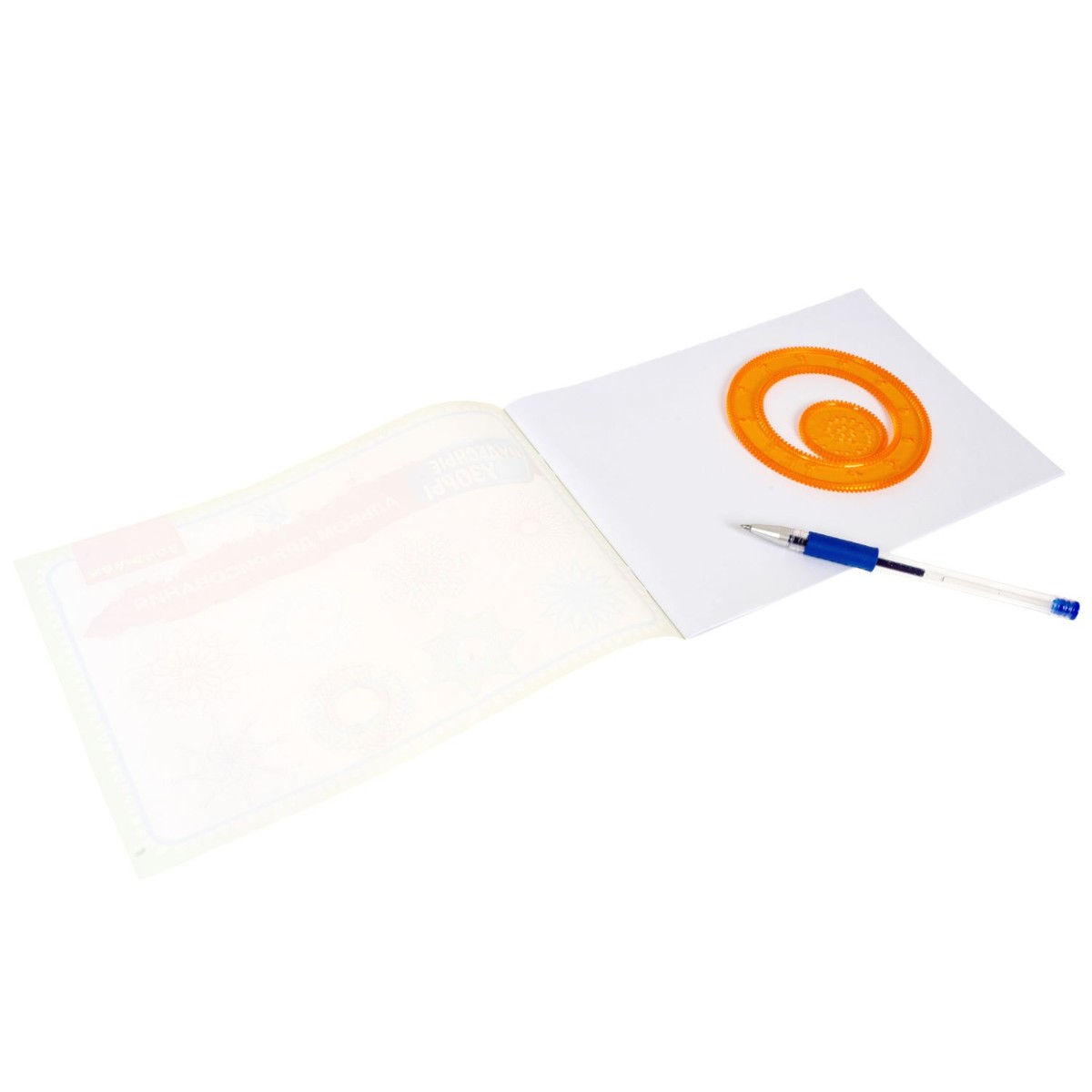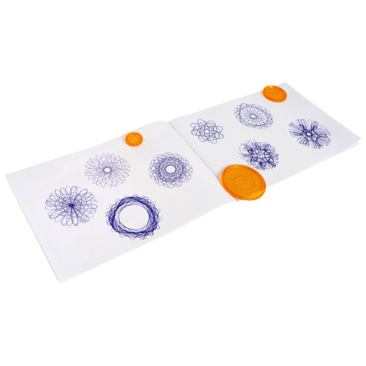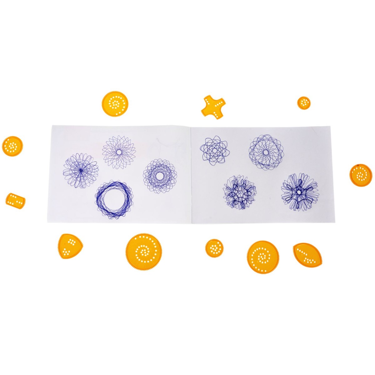 В комплекте: спирограф, 11 фигурных вкладыша, альбом для рисования и ручка.