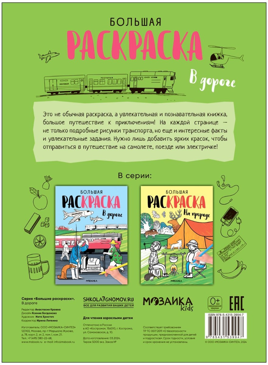 В раскраске "В дороге" из серии "Большие раскраски" есть все, чтобы ребенку было интересно: много страниц и большой простор для творчества, подробные и атмосферные иллюстрации, погружающие в мир железных дорог, аэропортов и метро; любопытные факты и занимательные задания на развитие логики и внимания. Раскрашивая картинки, ребенок откроет для себя много нового и увлекательно проведет время. Нужно лишь добавить ярких красок, чтобы отправиться к приключениям!