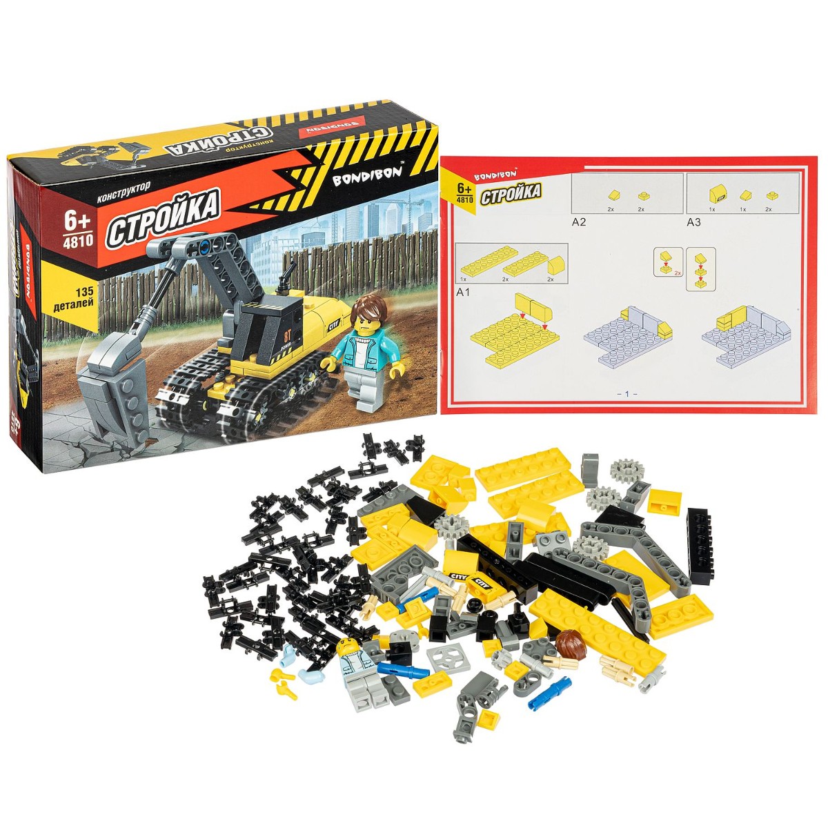 Конструктор серии Стройка Bondibon ВВ4810 "ЭКСКАВАТОР" содержит 135 деталей, из которых можно собрать модель экскаватора на гусеничном ходу и мини-фигурку человечка.