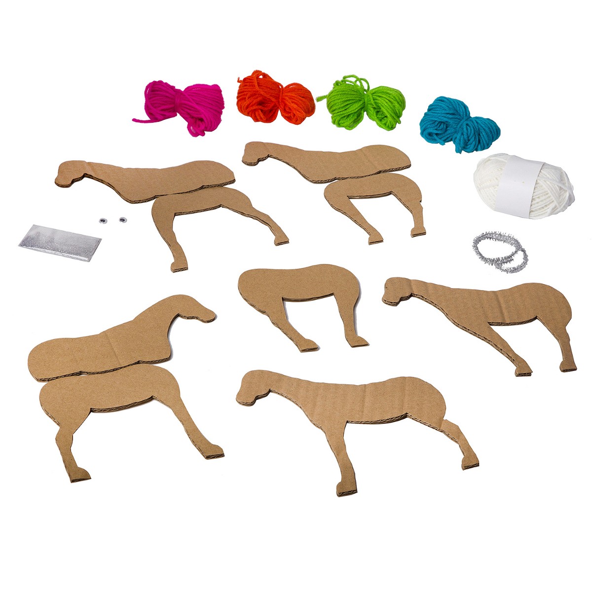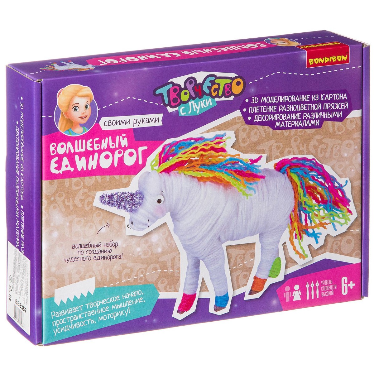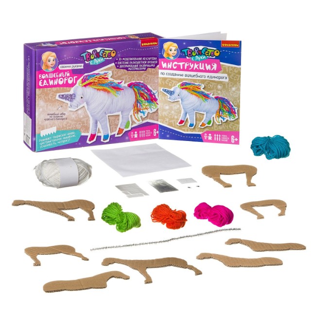 Это уникальный набор, объединяющий в себе сразу несколько видов творчества: 3D-моделирование из картона, плетение разноцветной пряжей, декорирование различными материалами. Немного усидчивости и вдохновения, и у Вас - необычная стильная игрушка в виде сказочного белого единорога с радужной гривой. В составе: запчасти из гофрокартона, разноцветная пряжа, блески, мишура на проволочной основе, двусторонний скотч, самоклеящиеся глаза, инструкция по сборке.