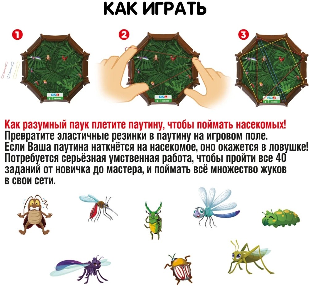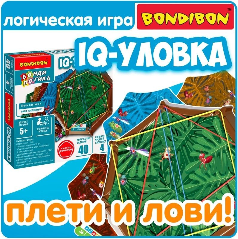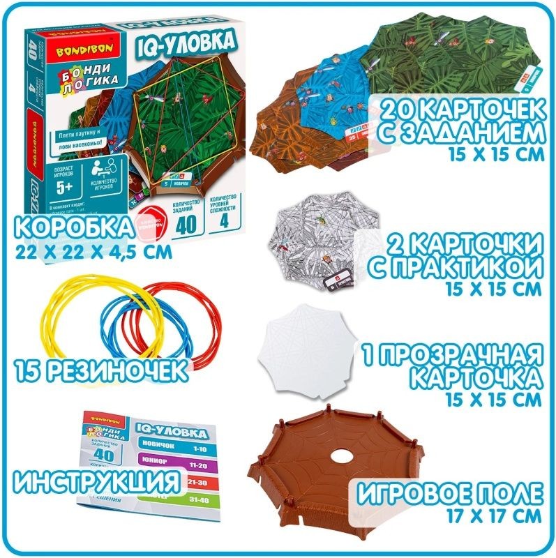 Поймайте насекомых с помощью эластичной паутины! Настольная логическая игра IQ-УЛОВКА с цветными резинками серии БондиЛогика от Bondibon содержит 40 разных по сложности заданий для детей и взрослых. Поместите карточку на игровое поле. Положите поверх прозрачную карту с подсказками. Подберите резинки, указанные в задании. Натяните их на колышки так, чтобы поймать всех изображенных насекомых. Насекомых с маленькими кругами-мишенями нужно пересечь красной или желтой резинкой или оградить с двух сторон синей резинкой. Насекомые с большим двойным кругом-мишенью захватываются двумя и более резинками. Головоломка IQ-УЛОВКА серии БондиЛогика от Бондибон поможет развить внимание, сосредоточенность и логику. Для хранения детали игры крепятся к основанию резинками. В набор входят: игровое поле, 15 резинок трех цветов и размеров, 20 двусторонних карточек с заданиями, прозрачная карточка с паутиной, 2 двусторонние карточки с примерами, буклет. 4 уровня сложности Возраст 5+ Количество игроков 1
