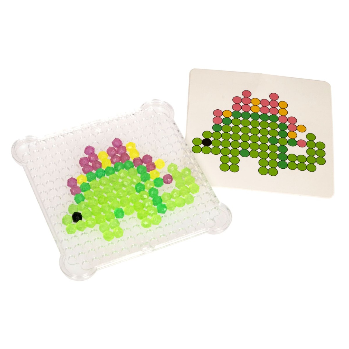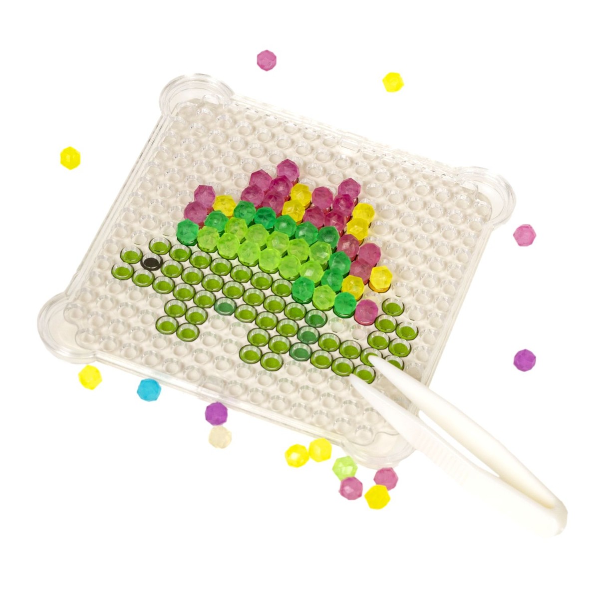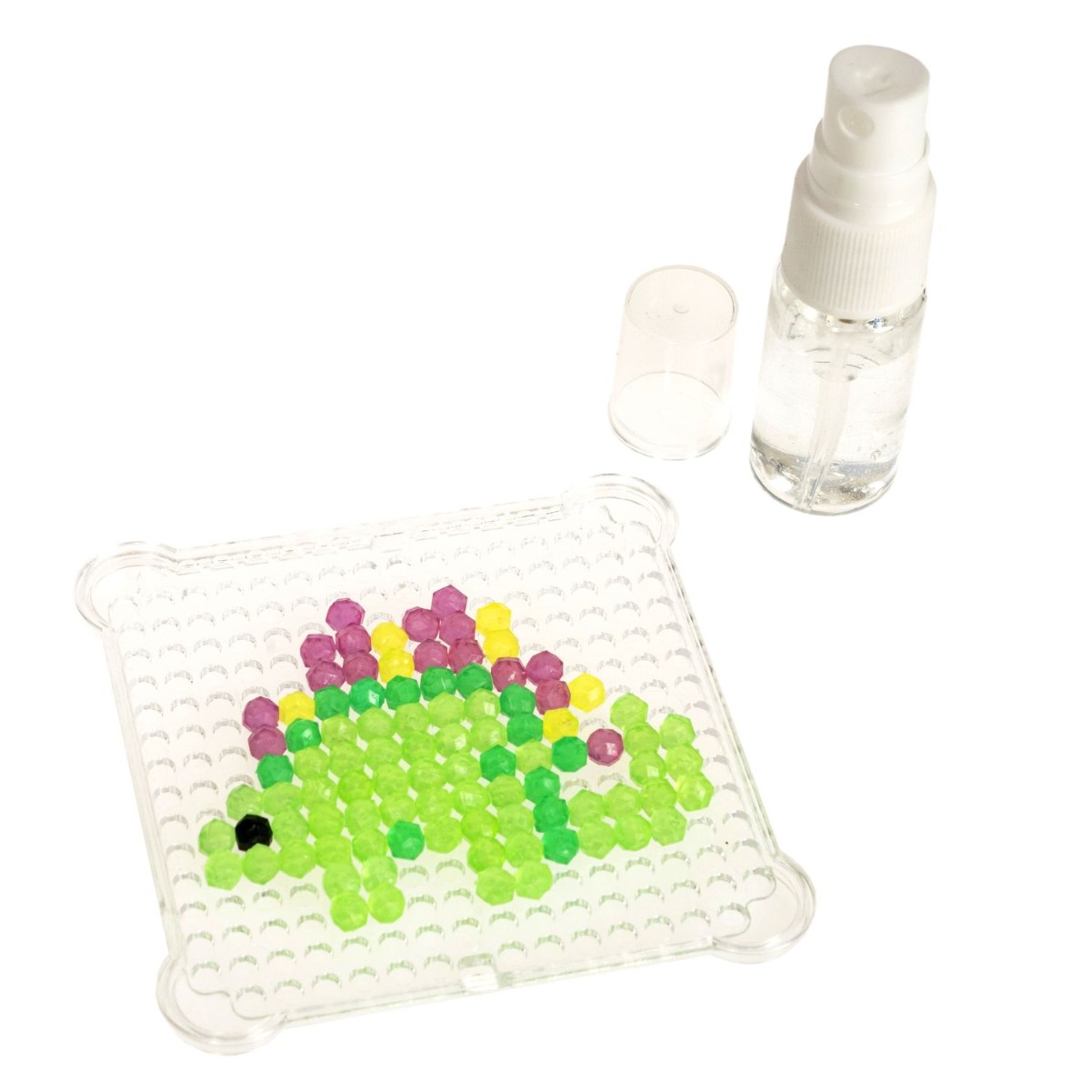 Разложите цветные шарики по трафарету, слегка смочите их водой, дайте им высохнуть и готовая фигурка из ярких бусин застынет!