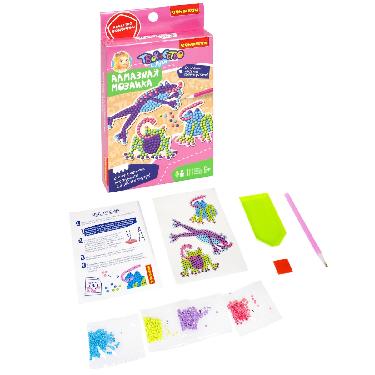 Три веселые лягушки совсем не хотят превращаться в царевну. А зачем? Ведь они уже сверкают королевскими стразами. Уникальный набор для творчества от Bondibon - АЛМАЗНАЯ МОЗАИКА! Красочные переливы каждого алмазика - фрагмента мозаики превращают творческий процесс в настоящее волшебство! Выкладывание страз прекрасно успокаивает, способствует снижению стресса, а также развивает мелкую моторику и цветовосприятие. Такое творчество привьет ребенку усидчивость и терпение, поможет развитию воображения. Перенесите стразы на основу, используя аппликатор: зацепите стразу с выпуклой стороны и наклейте на выбранный участок. У Вас получатся 3 крупных стикера с лягушатами. Собери свой комплект наклеек и укрась ими дневник, телефон, любимый блокнот и многое другое. В наборе для поделок цветные основы, набор мозаики и инструментов, инструкция. Серия Творчество с Луки – оригинальный подарок для творческих девочек и мальчиков! 6+