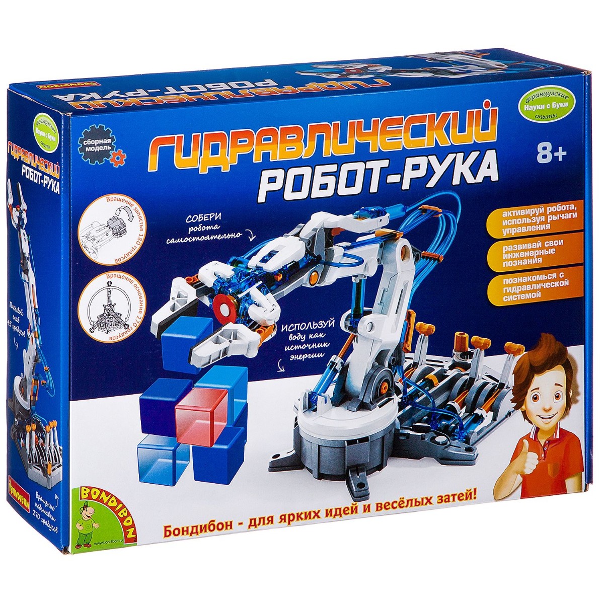 Наш робот-рука может развлечь и вызвать у ребенка неподдельный интерес к науке. Соединения гидравлической руки позволяют давать команды для выполнения 6 видов разных движений: открытие и закрытие захвата до 4,8 см, вращение запястья до 180 градусов, движение запястья до 98 градусов, сгибание локтя до 44 градусов, поворот основания на 270 градусов, поворот плечевого шарнира на 45 градусов. Величина вертикального перемещения составляет 41,5 см. Величина горизонтального перемещения - 31,5 см, подъемная способность 50 грамм. Если убрать захват, то станет возможной функция всасывающего вентилятора. Это очень удобно, когда надо поднять с пола предмет с большой площадью поверхности. Еще одна замечательная функция - система торможения, которая встроена в рычаг управления, чтобы аккуратно выполнить все команды. Узнай о принципах действия гидравлической системы и о способах ее применении. Рука станет отличным пособием по физике. Набор призван задействовать твои инженерные, математические, научные познания и технические навыки. Батареи или мотор не требуются. Робот работает на воде. Подробная инструкция с иллюстрациями помогут успешно справиться с 229 деталями из этого набора.