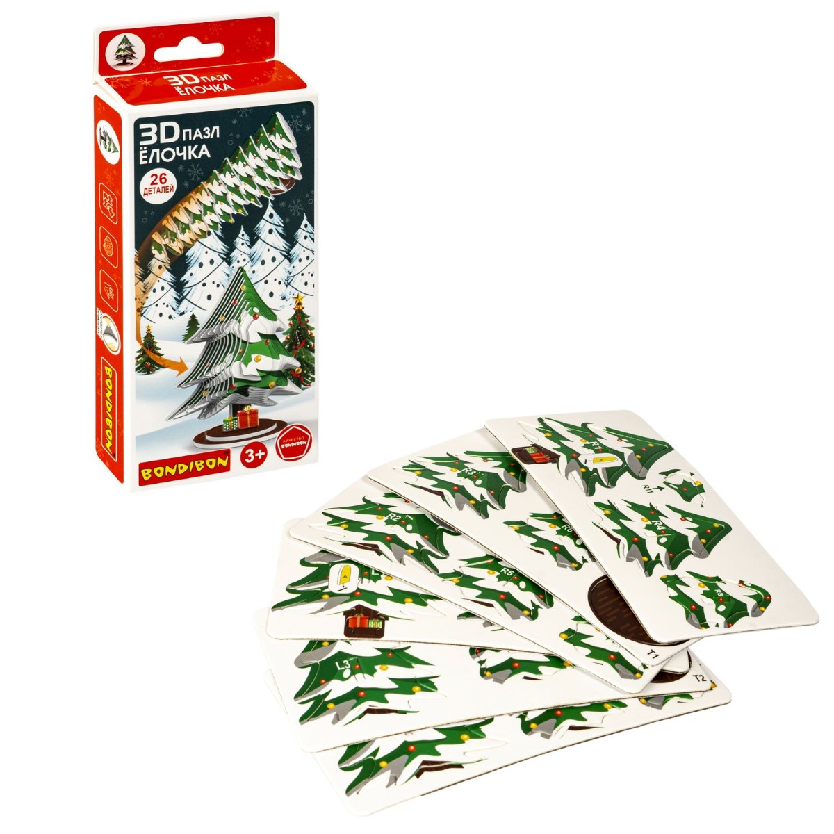 Новый год уже в пути, скоро к нам приедет. Ярче, елочка, свети. Ты на радость детям! Но чтобы Новый год наступил быстрее, детям нужно справиться с одним очень интересным заданием - сложить 3д пазл из набора для творчества Bondibon. У Вас получится фигурка елочки, украшенной к празднику и с подарками под ней. Сборка головоломки развивает у ребенка воображение, логическое мышление, мелкую мышечную моторику, внимание, целостность восприятия. А сам процесс подарит много радости малышу. Соберите поделку по инструкции. Детали собираются слоями, у каждой детали свое место. в конце сборки пазл обязательно скрепляется конечной деталью, удерживающей всю конструкцию. Новогодний набор для творчества будет приятным сюрпризом для девочек и мальчиков. Собирать пазлы можно начинать ребенку от 3 лет. В комплекте 26 деталей из плотного картона.