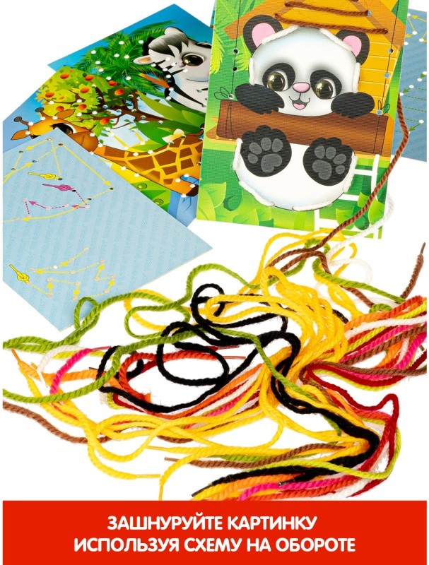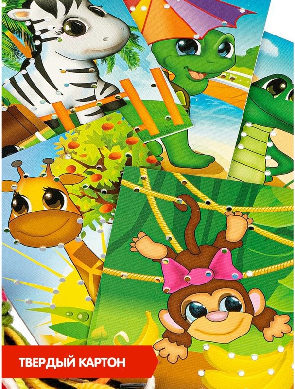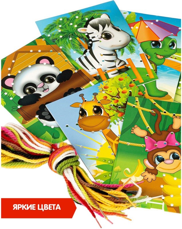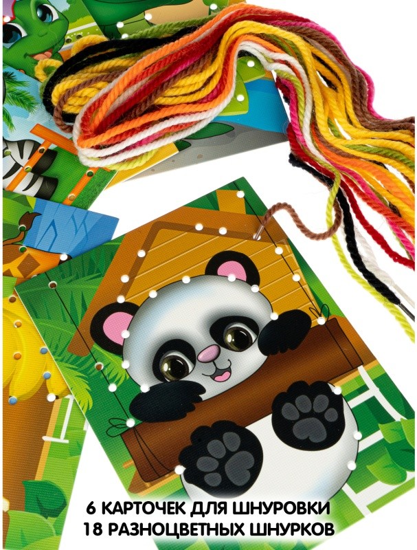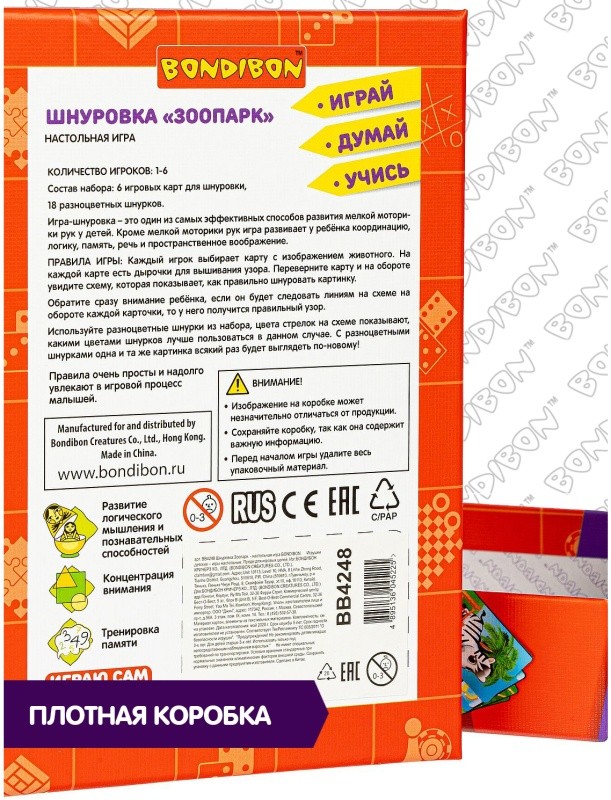 счастливое будущее вашего малыша. Простые правила, интересные задания и яркие привлекательные персонажи помогут ребенку развить одно из ключевых умений, важное для всей дальнейшей жизни. Игра ШНУРОВКА ЗООПАРК Bondibon тренирует мелкую моторику, которая влияет на качество речи и мышления ребенка. Кроме того, игра способствует развитию координации, концентрации внимания, усидчивости. Выберете карточку с изображением животного и специальными отверстиями для вышивания узора. Используя схему на обороте, проденьте шнурки в отверстия. Обратите внимание на изменения картинки на фронтальной части! В набор входят 6 карточек для шнуровки с изображениями животных, 18 цветных шнурков с наконечниками, коробка с правилами и рекомендациями. Детали выполнены из безопасных материалов, качество которых обеспечивает долговременное использование. Количество игроков1-6, возраст 3+.