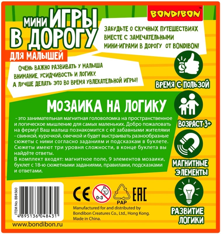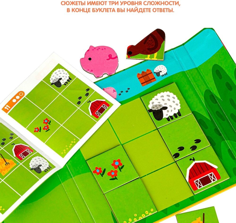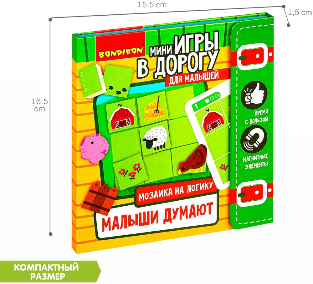 МОЗАИКА НА ЛОГИКУ "МАЛЫШИ ДУМАЮТ" - это занимательная магнитная головоломка на пространственное и логическое мышление для детей от 3 лет. Добро пожаловать на ферму! Ваш малыш познакомится с ее забавными жителями - свинкой, курочкой, овечкой и будет выстраивать разнообразные сюжеты с ними согласно заданиям и подсказкам в буклете. Сюжеты имеют три уровня сложности, в конце буклета вы найдете ответы. В комплект входят: магнитное поле, 9 элементов мозаики, буклет с 18-ю сюжетными заданиями. правилами, подсказками и ответами. Забудьте о скучных путешествиях вместе с замечательными мини-играми в дорогу от BONDIBON!