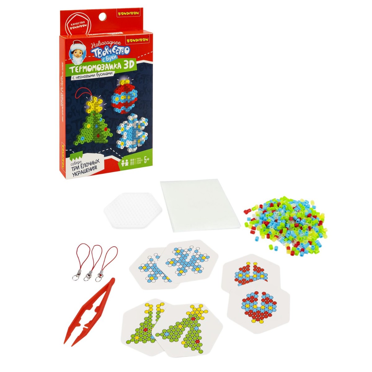 Сделайте елочные украшения своими руками с набором для творчества ТЕРМОМОЗАИКА ШАР, СНЕЖИНКА, ЕЛКА 3D серии Новогоднее Творчество с Буки от Bondibon! Три красочные поделки с неоновыми бусинами светятся в темноте и создают атмосферу праздника! Каждая фигурка состоит из двух частей. Соберите каждую часть на планшете и прогладьте утюгом через кальку. Когда части фигурки остынут, соедините их в 3D модель. Новогодняя поделка готова! Прикрепите к елочке, шарику, снежинке подвески, чтобы повесить украшения на елку или носить объемную фигурку, как брелок. Непременно зарядите игрушки на солнце или под лампой, чтобы они светились в темноте! Творческий процесс развивает мелкую моторику, внимание, усидчивость, аккуратность и гарантирует праздничное настроение! О качестве и безопасности позаботился Бондибон. В набор входят: набор термобусин, планшет, калька, цветные схемы, пинцет, подвески. Возраст 5+ ТЕРМОМОЗАИКА ШАР, СНЕЖИНКА, ЕЛКА 3D – интересный и полезный подарок для детей на Новый год!
