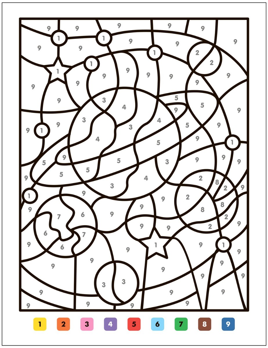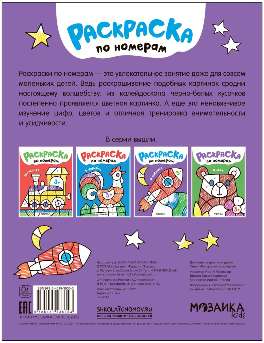 В книге "В космосе" серии "Раскраски по номерам" ребенка ждет настоящая мозаика из кусочков рисунка. Нужно лишь раскрасить каждый кусочек по цифрам в соответствии с легендой. Немного терпения ― и яркие космические картинки готовы! А еще раскраски по номерам – это ненавязчивое изучение цифр, цветов и отличная тренировка внимательности и усидчивости.