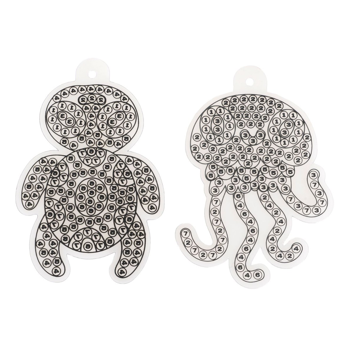У Вас получатся 2 крупных стикера (9х13 см)– веселая медуза и морская черепаха. Готовые наклейки прикрепите к стеклу с помощью присосок.