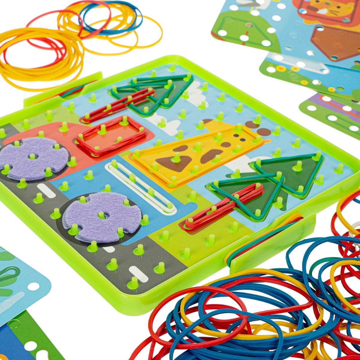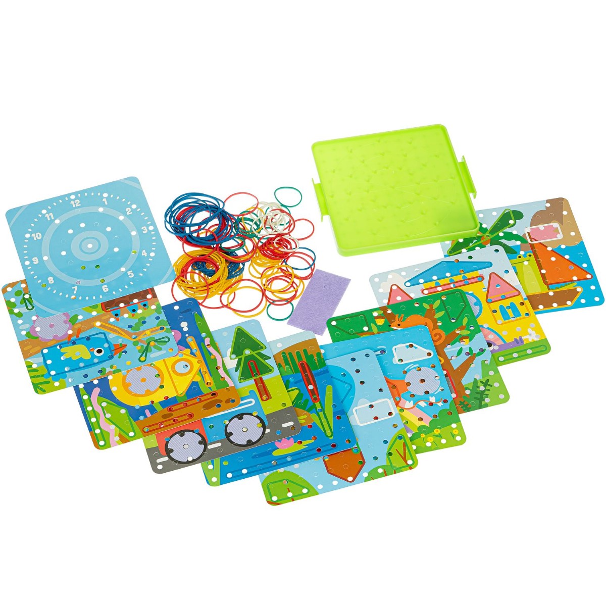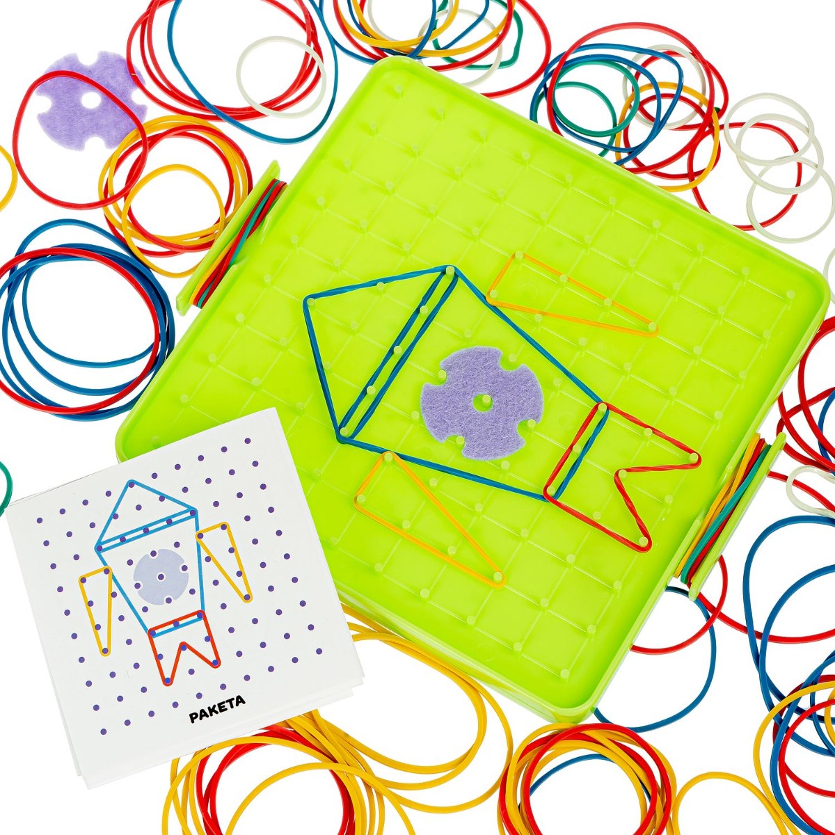 В комплект игры входят: двусторонний геоборд с креплениями для хранения резинок, 10 цветных сюжетов и 14 схем сборки, резинки 5 цветов и 3х размеров, элементы из фетра.