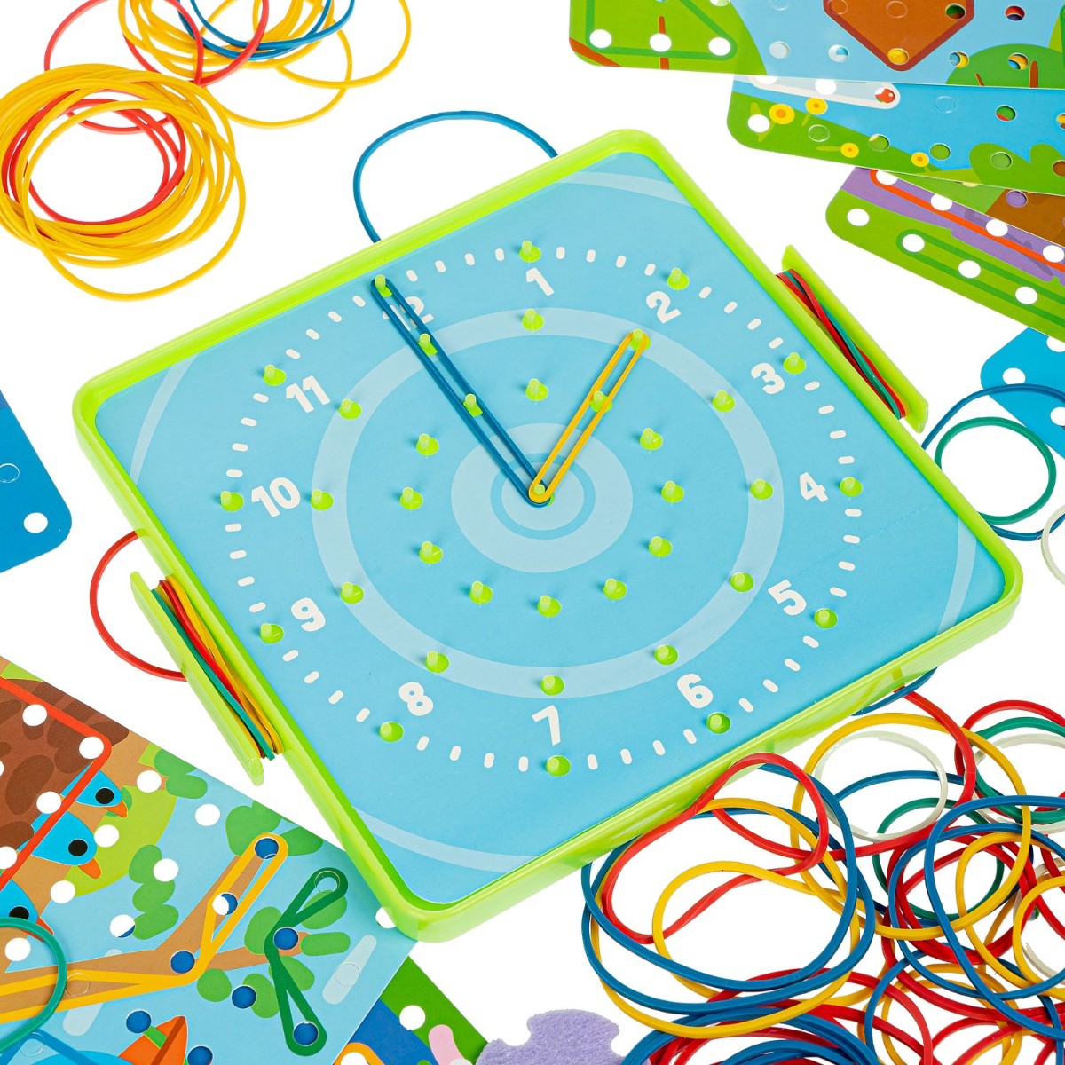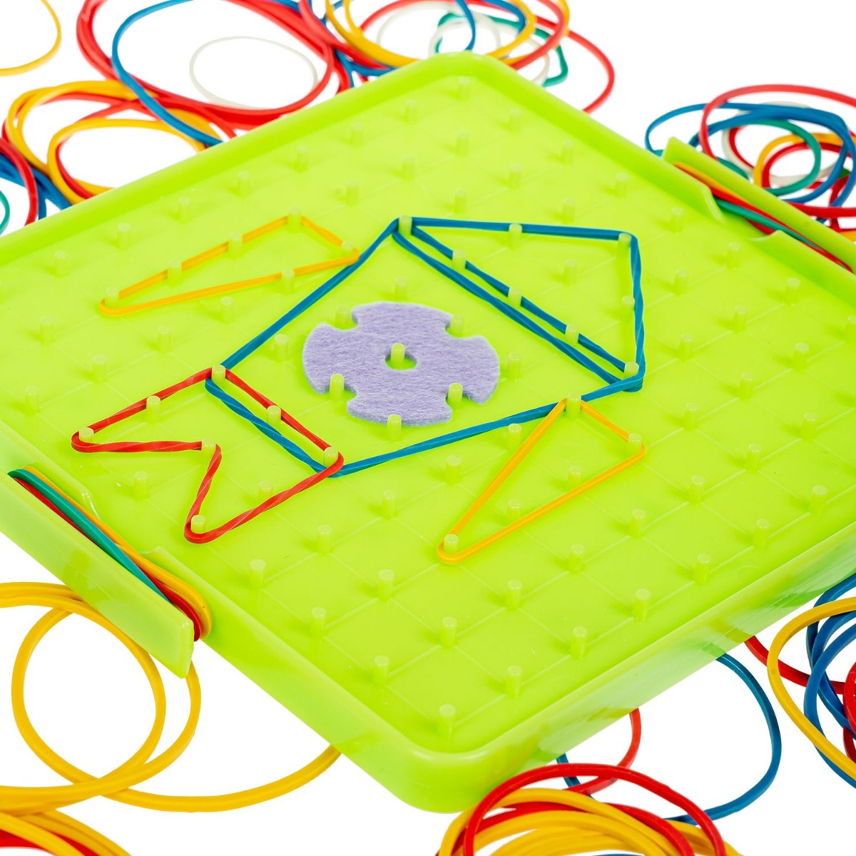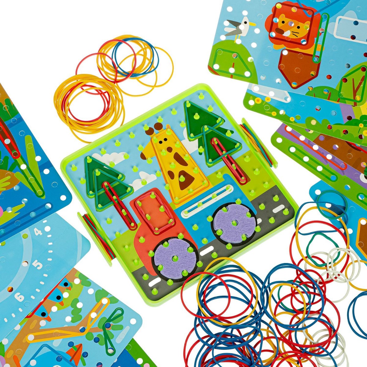 В комплект игры входят: двусторонний геоборд с креплениями для хранения резинок, 10 цветных сюжетов и 14 схем сборки, резинки 5 цветов и 3х размеров, элементы из фетра.