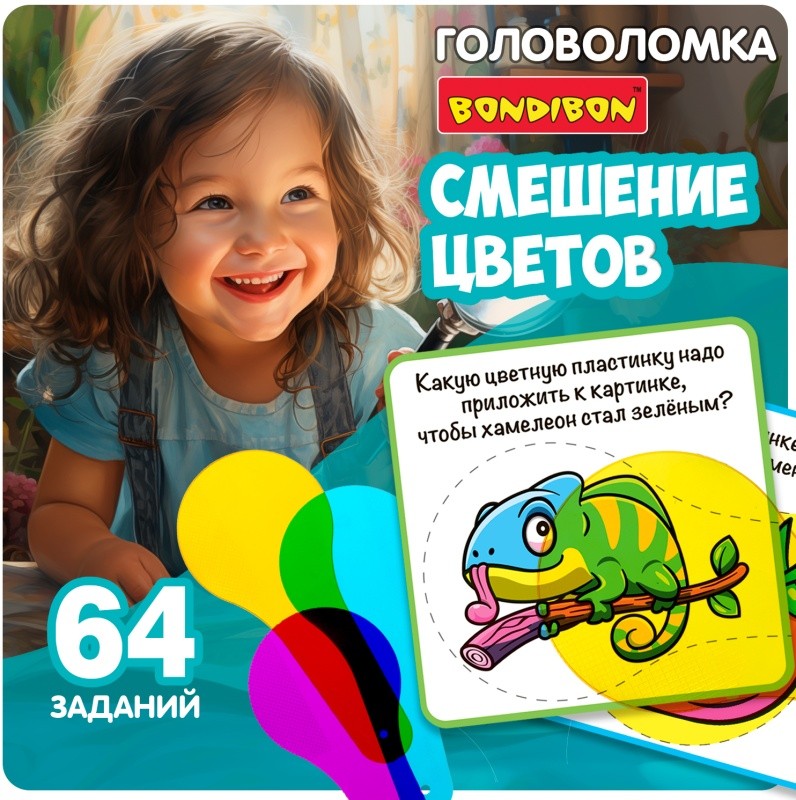 Красочная головоломка с волшебными картинками, которые меняют цвет прямо на глазах! Настольная развивающая игра СМЕШЕНИЕ ЦВЕТОВ серии БондиЛогика от Bondibon содержит 64 задания разных уровней сложности, которые будут интересны и маленьким детям, и дошкольникам. Выполните задание, указанное на карточке. Подберите пластину, приложите ее к карточке и наблюдайте за изменением цвета картинки. Постепенно переходите от простых заданий к более сложным. Игра СМЕШЕНИЕ ЦВЕТОВ серии БондиЛогика от Бондибон способствует изучению различных цветов, геометрических фигур, названий овощей и фруктов, развивает логическое мышление, внимание и расширяет кругозор. Необычная головоломка не только станет прекрасным подарком для ребенка на день рождения, Новый год и любой другой праздник, но и поможет подготовить его к школе. Игра изготовлена из качественных безопасных материалов. В набор входят: 32 двусторонние карточки, 6 разноцветных пластин. Возраст 3+ 4 уровня сложности Количество игроков 1