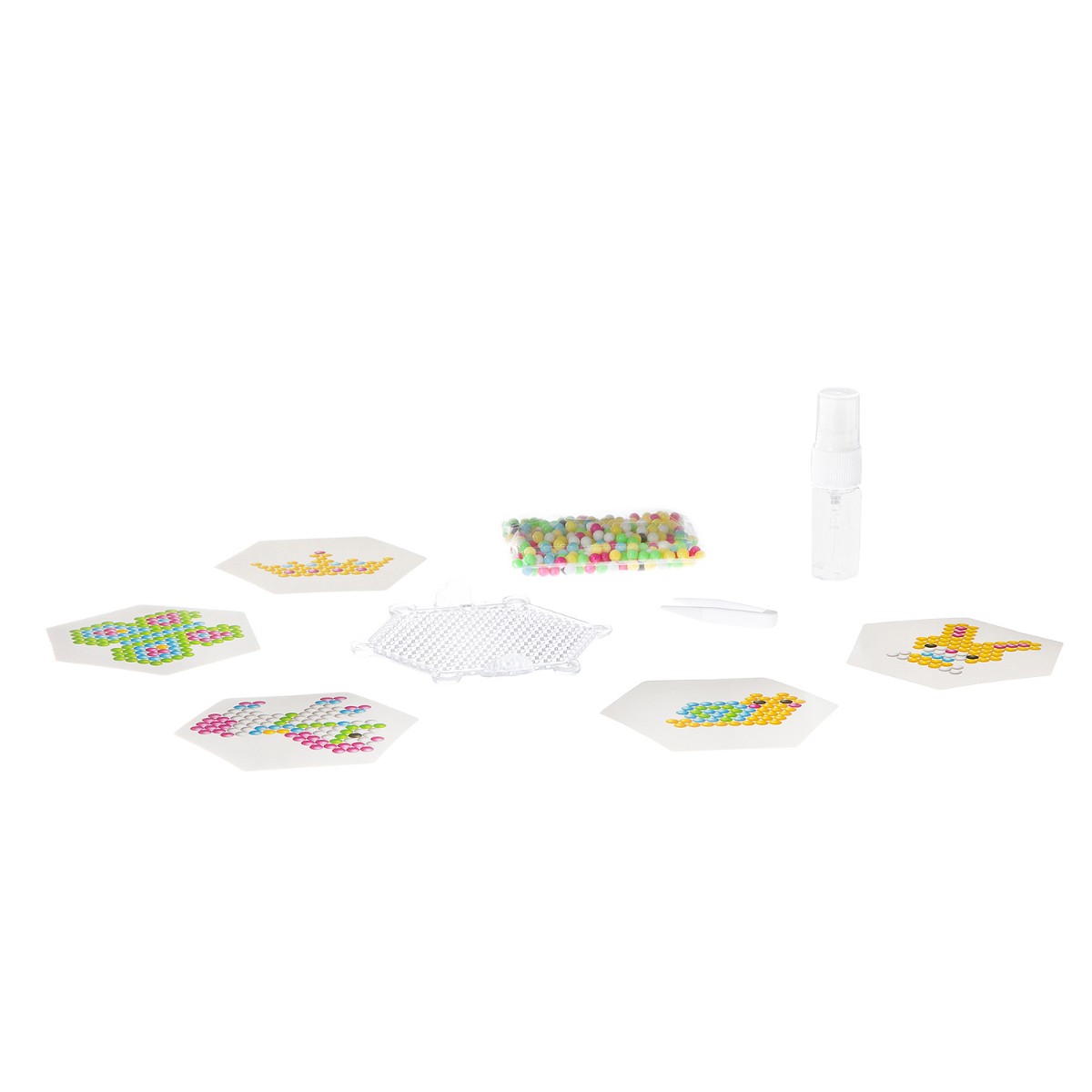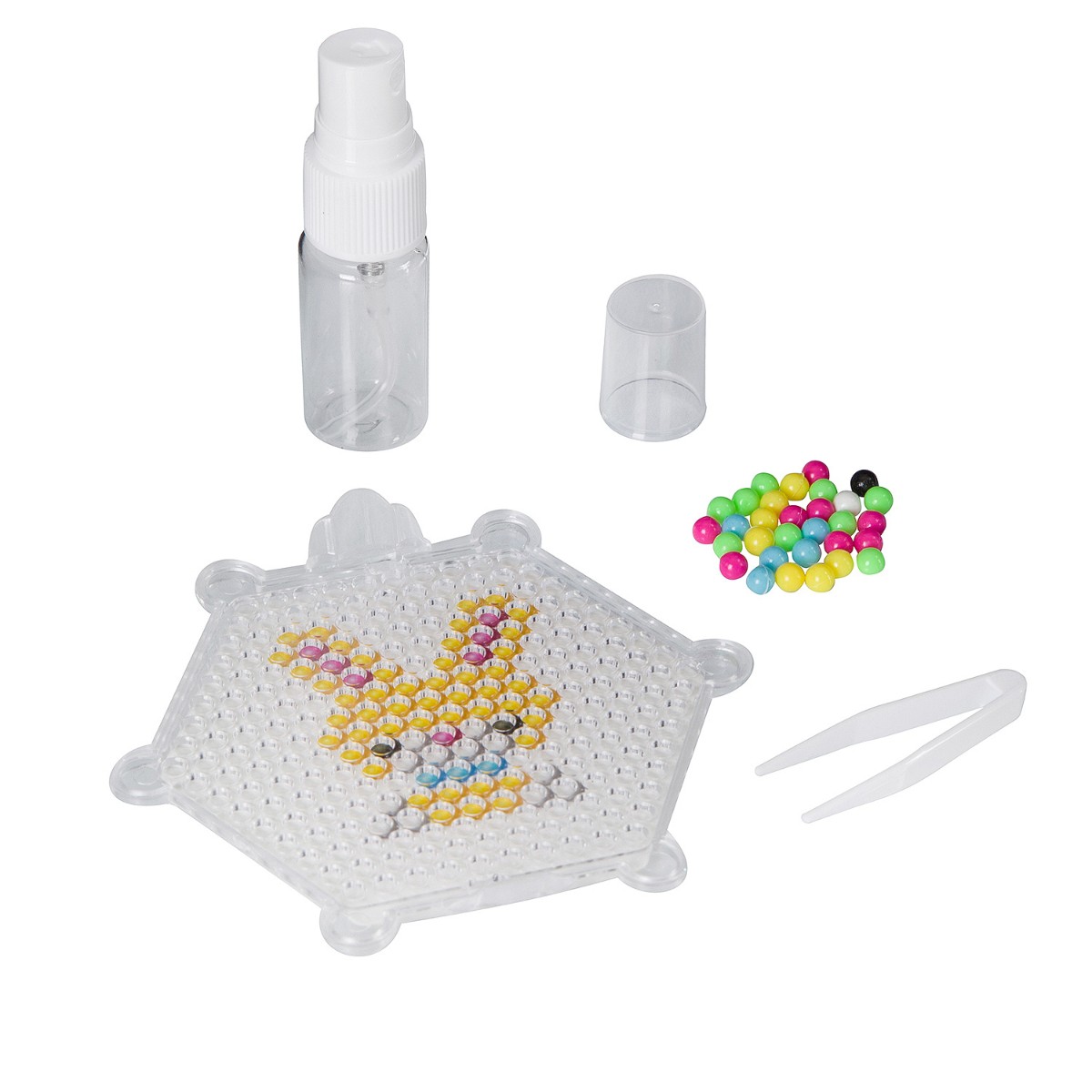 Разложите цветные шарики по трафарету, слегка смочите их водой, дайте им высохнуть и готовая фигурка из ярких бусин застынет!