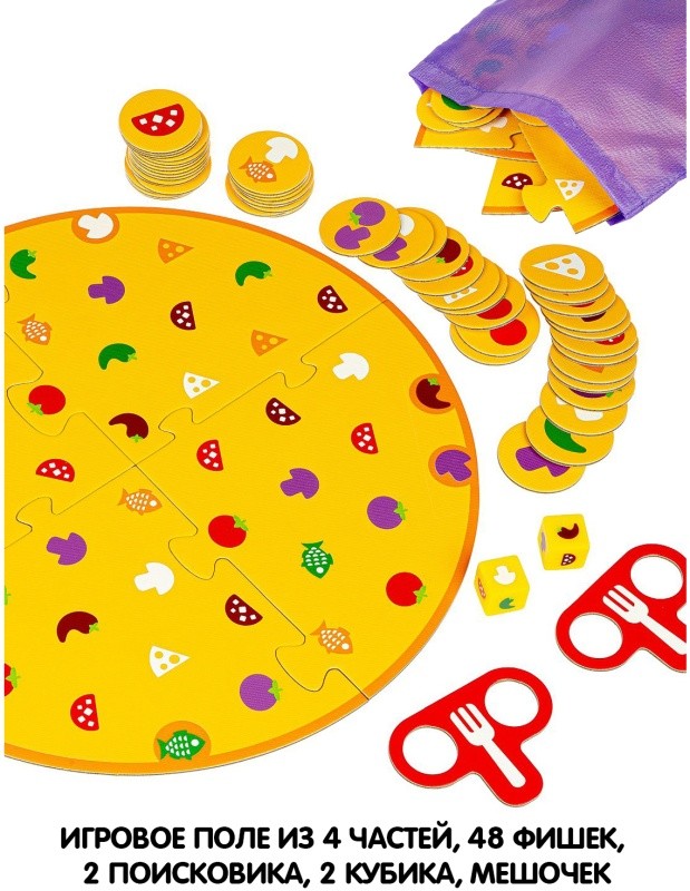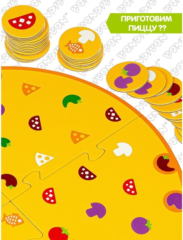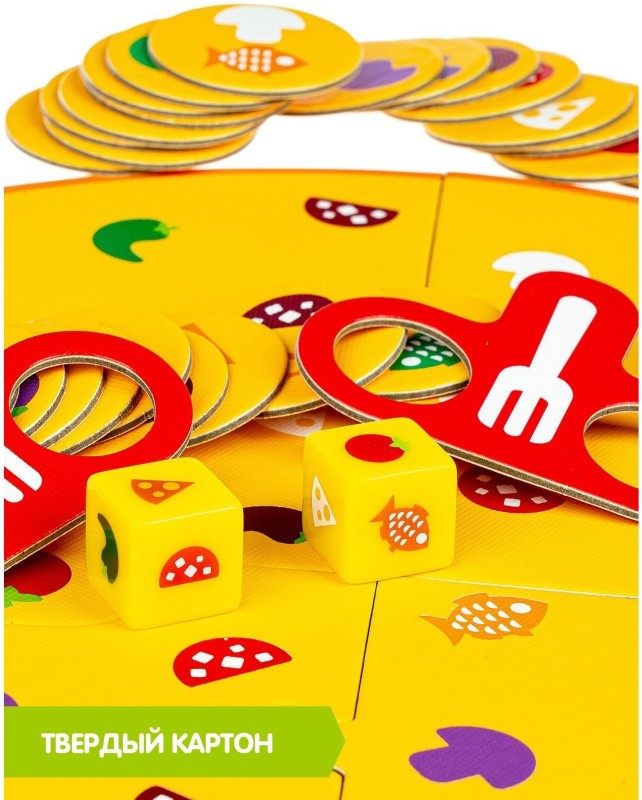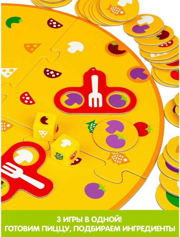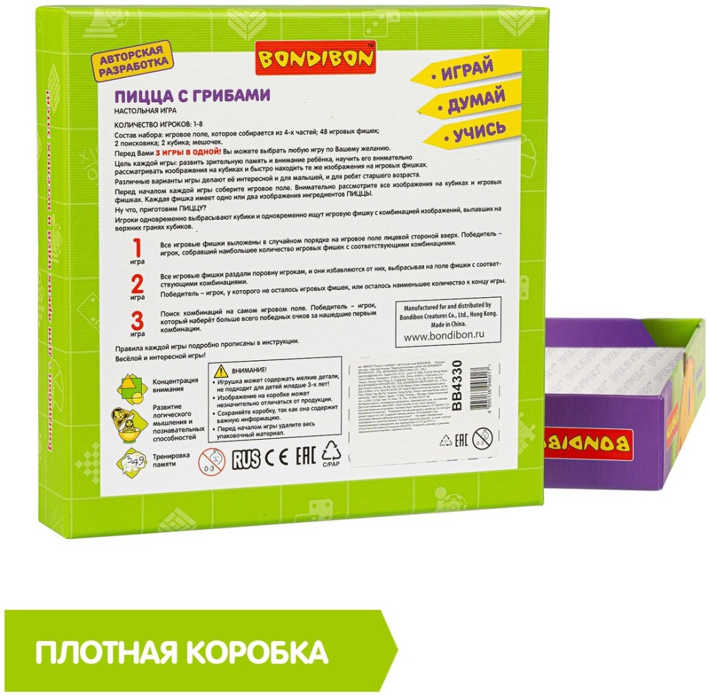 Порадуйте ребенка увлекательной настольной игрой ПИЦЦА С ГРИБАМИ от Bondibon! Авторская разработка серии Играй Думай Учись – отличный способ развить зрительную память и внимание детей. Соберите из 4 частей поле. Выберите одну из трех игр по Вашему желанию. Внимательно рассмотрите изображения на кубиках и фишках. Ну что, приготовим ПИЦЦУ? Одновременно выбрасывайте все кубики и ищите фишку с комбинацией изображений, выпавших на верхних гранях. В процессе игры ребенок получит массу положительных эмоций, разовьет логическое мышление и познавательные способности. В набор входят: игровое поле, которое собирается из 4-х частей, 48 игровых фишек, 2 поисковика, 2 кубика, мешочек. Количество игроков 1-8 Возраст 4+ Соберите коллекцию развивающих игр серии Играй Думай Учись от Бондибон!
