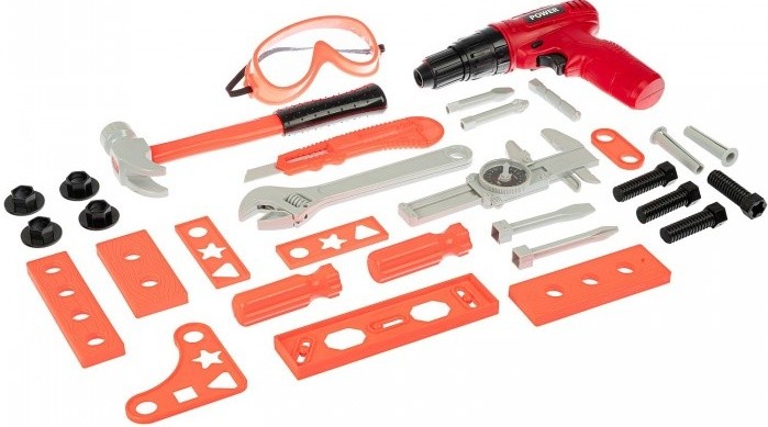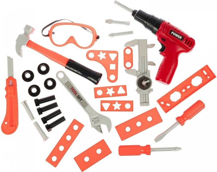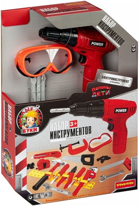 Почувствуй себя настоящим мастером ремонтных дел! Набор строительных инструментов ПАПИНЫ ДЕТИ от Bondibon содержит 27 предметов, включая шуруповерт на батарейках и маску. Яркий реалистичный дизайн привлечет детей. А возможность подержать в руках и испытать в действии почти настоящие инструменты – позволит удержать внимание. И это совершенно безопасно! Придумывая интересные игровые сюжеты, малыш приобретет полезные навыки работы по дому, поймет для чего нужны различные инструменты и выучит их названия. Игровой набор выполнен из качественных безопасных материалов. В набор входят: дрель-шуруповерт с насадками на батарейках, маска, разводной ключ, отвертка со сменными головками, молоток, штангенциркуль, строительный нож, болты с гайками, трафареты и аксессуары. Для работы электроинструмента понадобятся 2 батарейки АА (в набор не входят). 3+ Набор строительных инструментов ПАПИНЫ ДЕТИ от Бондибон станет желанным подарком для мальчика на день рождения, 23 февраля и любой другой праздник.