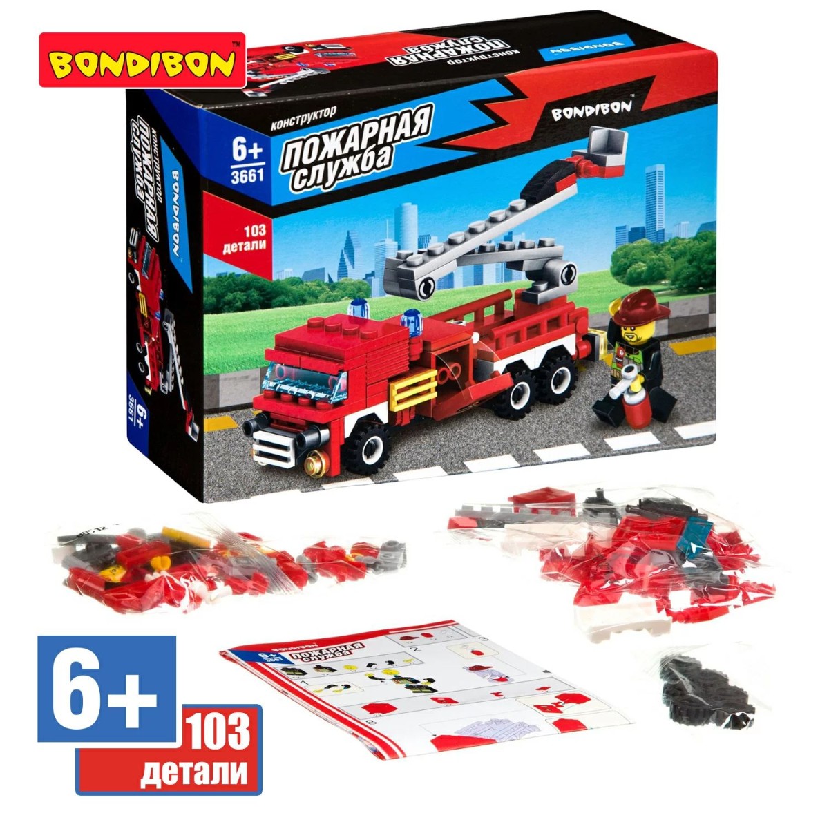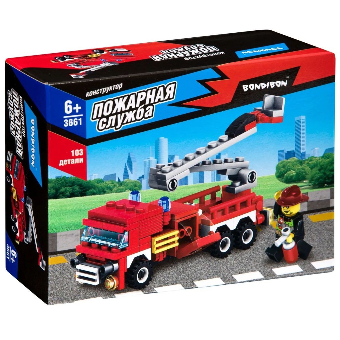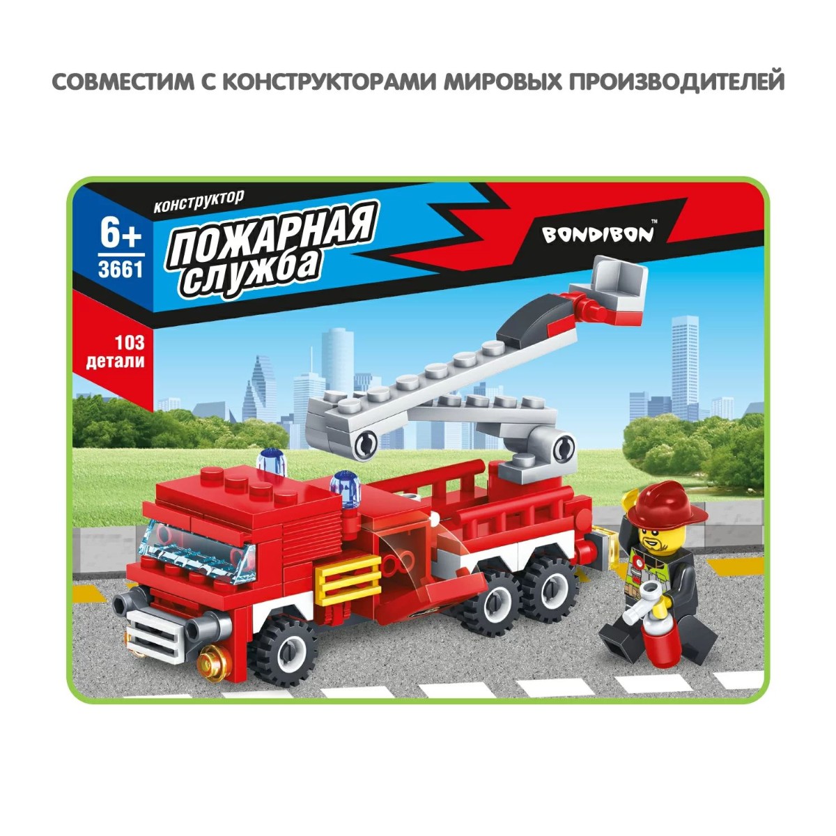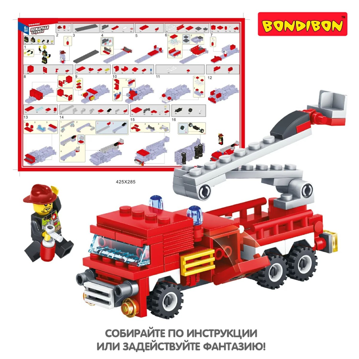 Собери грузовик со спасательной лестницей и человечка, чтобы играть в пожарного! Блочный конструктор ПОЖАРНАЯ МАШИНА из коллекции ПОЖАРНАЯ СЛУЖБА от Bondibon развивает мелкую моторику, мышление и дает детям большой простор для фантазии! В большом наборе 103 качественные детали для сборки, которые легко и надежно соединяются между собой. Соберите модель специального транспортного средства и фигурку пожарного, следуя подробной инструкции, и придумайте различные сюжетно-ролевые игры. Машинка может двигаться вперед и назад. А еще можно раздвигать складную лестницу. Игрушка развивает интерес к конструированию, моделированию, познавательные способности, внимание, логическое и пространственное мышление. ПОЖАРНАЯ МАШИНА от Бондибон – интересный и полезный подарок для мальчика. Детали совместимы с деталями конструкторов мировых производителей. В набор входят: 103 детали для сборки, инструкция. Возраст 6+ Расширяйте игровое пространство, собирая коллекцию конструкторов ПОЖАРНАЯ СЛУЖБА!