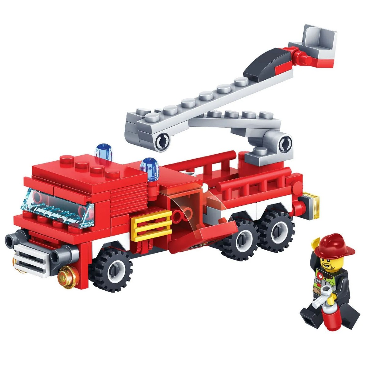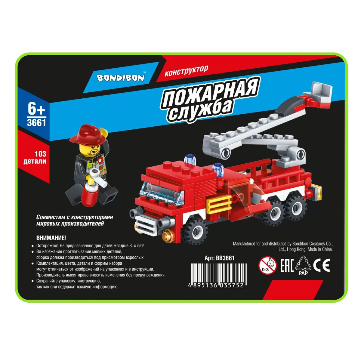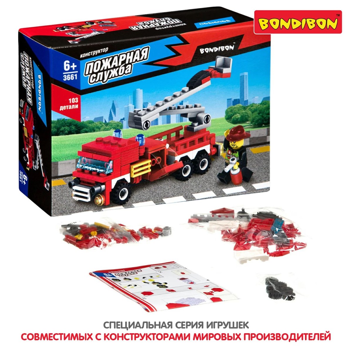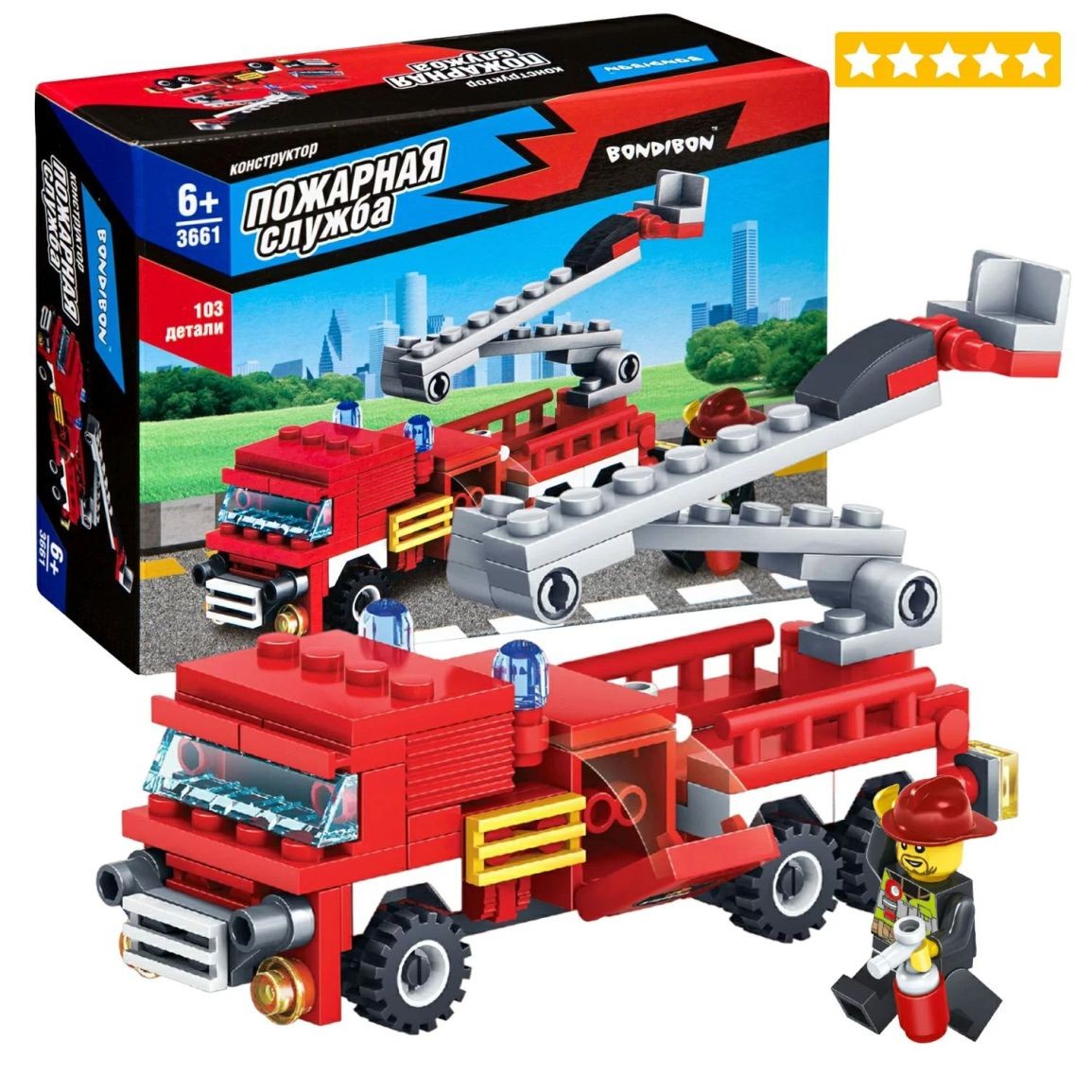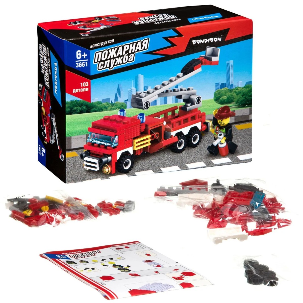 Собери грузовик со спасательной лестницей и человечка, чтобы играть в пожарного! Блочный конструктор ПОЖАРНАЯ МАШИНА из коллекции ПОЖАРНАЯ СЛУЖБА от Bondibon развивает мелкую моторику, мышление и дает детям большой простор для фантазии! В большом наборе 103 качественные детали для сборки, которые легко и надежно соединяются между собой. Соберите модель специального транспортного средства и фигурку пожарного, следуя подробной инструкции, и придумайте различные сюжетно-ролевые игры. Машинка может двигаться вперед и назад. А еще можно раздвигать складную лестницу. Игрушка развивает интерес к конструированию, моделированию, познавательные способности, внимание, логическое и пространственное мышление. ПОЖАРНАЯ МАШИНА от Бондибон – интересный и полезный подарок для мальчика. Детали совместимы с деталями конструкторов мировых производителей. В набор входят: 103 детали для сборки, инструкция. Возраст 6+ Расширяйте игровое пространство, собирая коллекцию конструкторов ПОЖАРНАЯ СЛУЖБА!