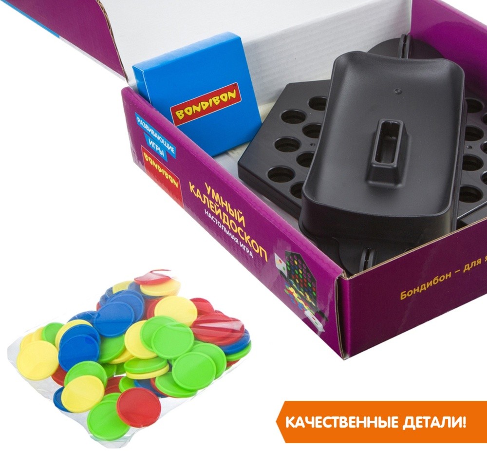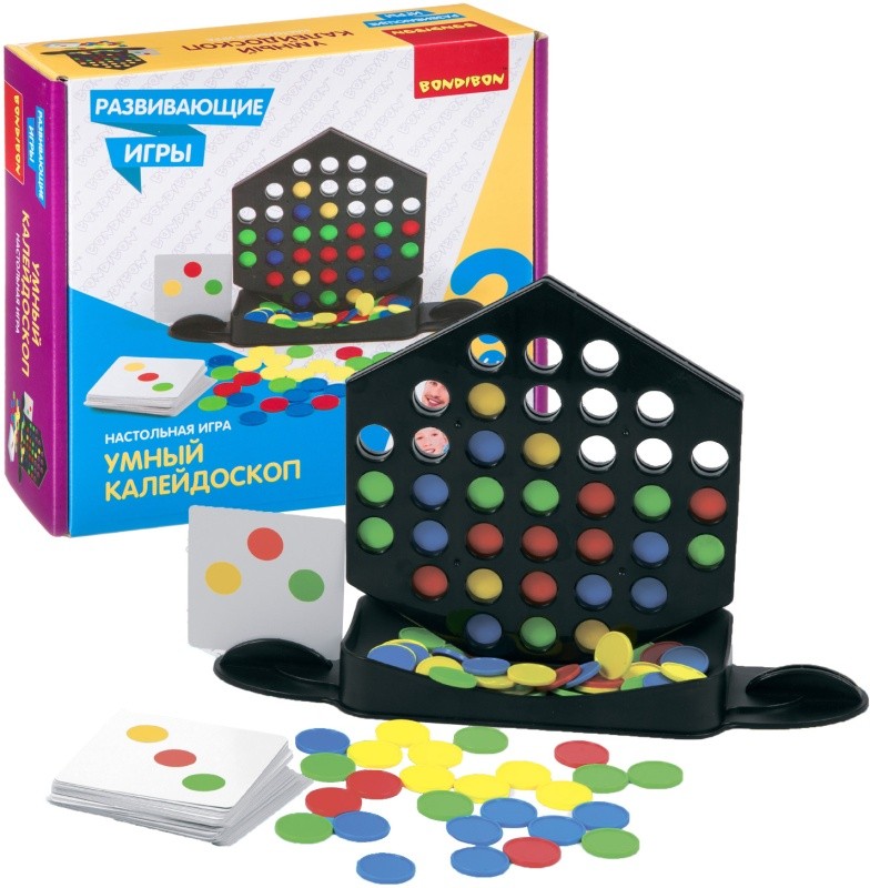 Собери цветную комбинацию быстрее соперников! Развивающая настольная игра УМНЫЙ КАЛЕЙДОСКОП от Bondibon поможет занять детей дошкольного и младшего школьного возраста. Установите игровое поле в центре стола. Вставьте карточки с обеих сторон и сложите фишки на подставку. Попытайтесь повторить комбинацию, указанную в задании. Поочередно опускайте фишки в отверстия игрового поля. Если Вы справились с заданием первым, заберите себе карточку. Освободите игровое поле от фишек, если оно заполнено. Победителем становится участник, который соберет наибольшее количество карт. Настольная игра УМНЫЙ КАЛЕЙДОСКОП способствует развитию зрительно-моторной координации движений, цветовосприятия, логического мышления, концентрации внимания и любознательности. В комплект входят: 72 фишки, 40 карт (заданий), игровое поле, мешочек для хранения. Количество игроков 1-2 Возраст 6+ Соберите всю серию РАЗВИВАЮЩИХ ИГР от Бондибон!