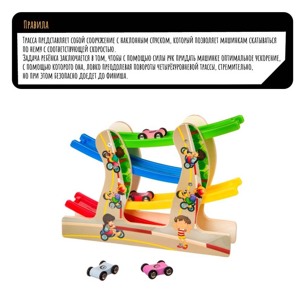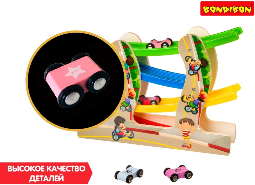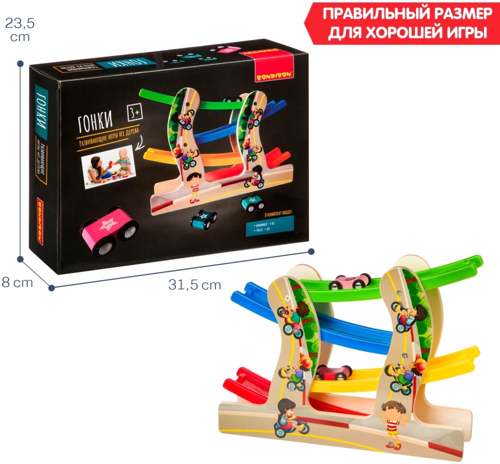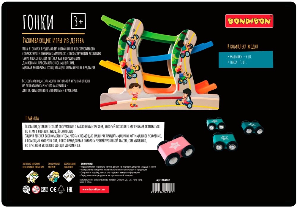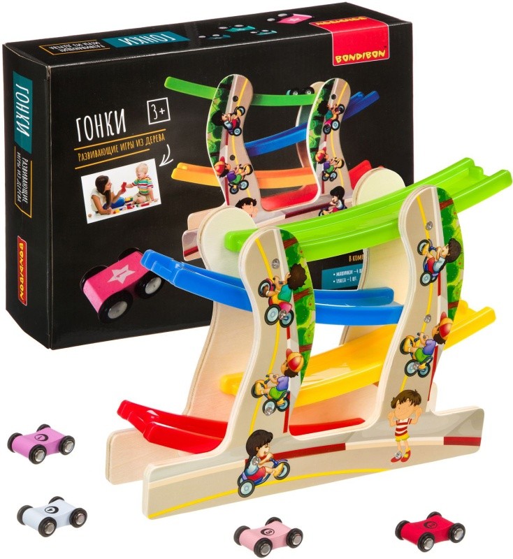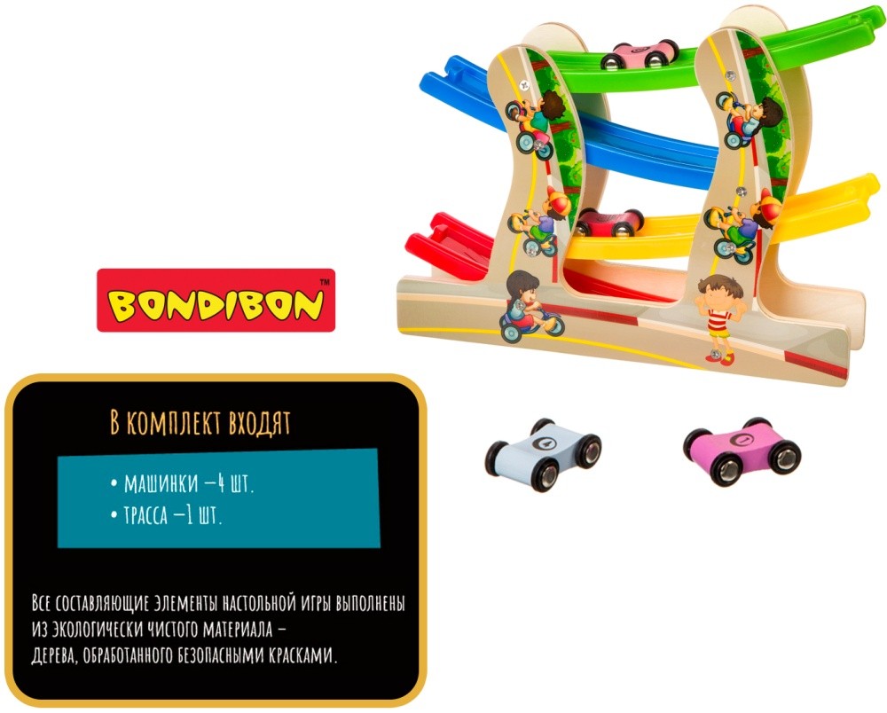 Красочная четырехуровневая трасса с машинками предназначена для самостоятельных игр и соревнований в компании друзей. Развивающая игра из дерева ГОНКИ от Bondibon будет одинаково интересна малышам, дошкольникам и даже детям младшего школьного возраста. Трасса представляет собой сооружение с наклонным спуском, который позволяет машинкам скатываться по нему с соответствующей скоростью. С помощью силы рук придайте гоночному болиду оптимальное ускорение, чтобы он доехал до финиша. Игра ГОНКИ серии Развивающие игры из дерева от Бондибон поможет ребенку запомнить основные цвета: красный, желтый, синий, зеленый, разовьет тактильные навыки, мелкую моторику, зрительное восприятие, эмоциональный интеллект, логическое и пространственное мышление. Все составляющие элементы настольной игры выполнены из экологически чистого материала – дерева, обработанного безопасными красками. В набор входят: 4 машинки, трасса. Возраст 3+ Необычная гоночная трасса с машинками - отличный подарок для мальчика!