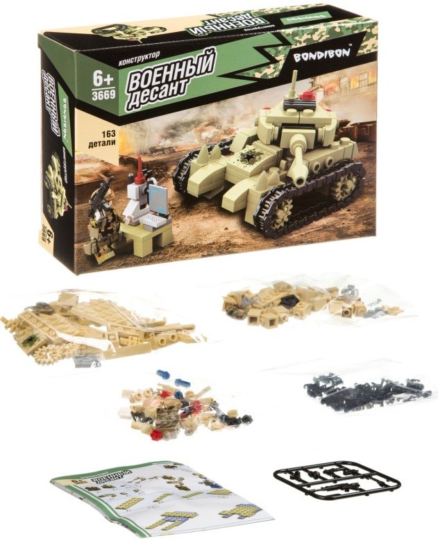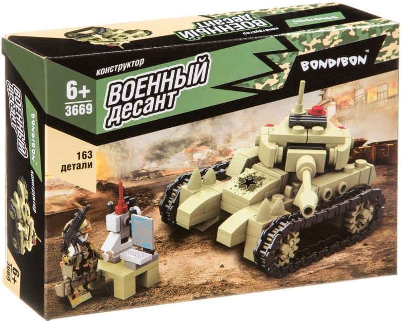 Этот набор создан специально для детей, которые увлечены военной техникой и конструированием! Блочный конструктор ТАНК из коллекции ВОЕННЫЙ ДЕСАНТ от Bondibon дает ребенку возможность самостоятельно собрать модель боевой машины и человечка для игры в войнушку. Детали соединяются легко и надежно, а в результате у Вас получатся реалистичный танк, фигурка солдата с оружием и пункт управления. Сборка игрушки развивает мелкую моторику, внимательность, логику, пространственное воображение, а также интерес к моделированию. Кроме того, сюжетно-ролевые игры с военным транспортом помогают сформировать у ребенка психологию защитника – борца за добро. Конструктор ТАНК от Бондибон станет прекрасным подарком для мальчиков на день рождения, 23 февраля и по любому другому поводу. Детали данного набора совместимы с деталями конструкторов мировых производителей. В набор входят: 163 детали для сборки, инструкция. Возраст 6+ Расширяйте игровое пространство, собирая коллекцию конструкторов ВОЕННЫЙ ДЕСАНТ!