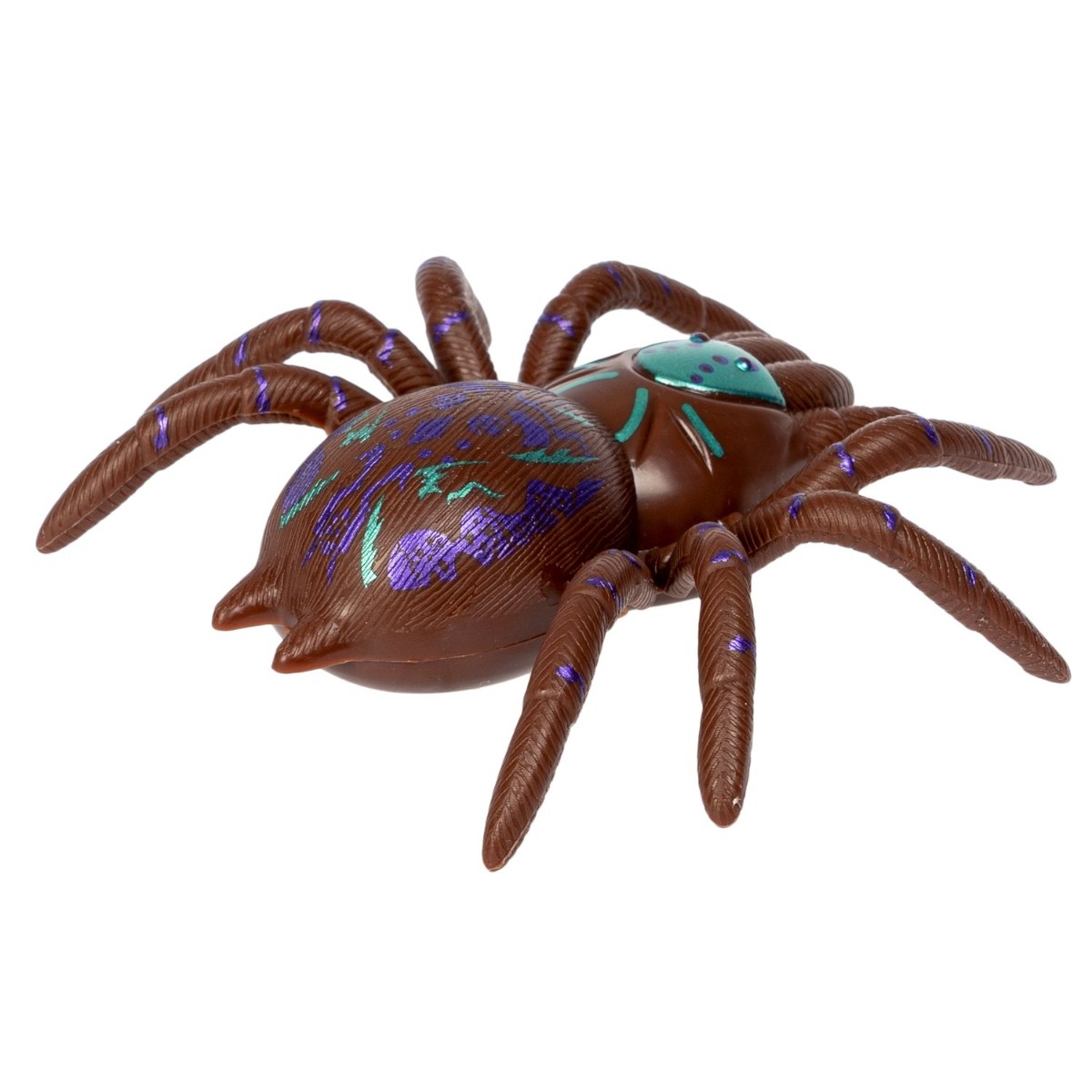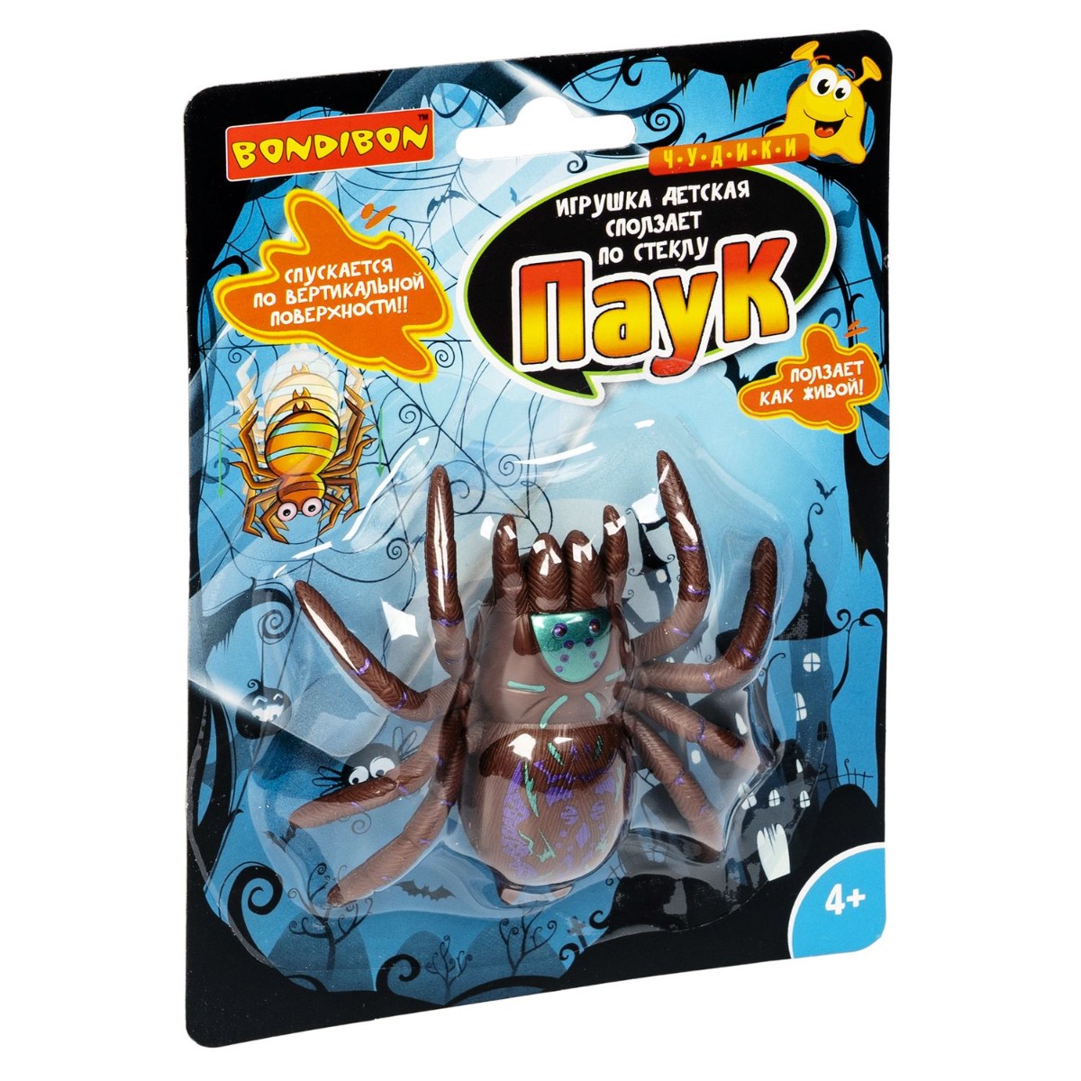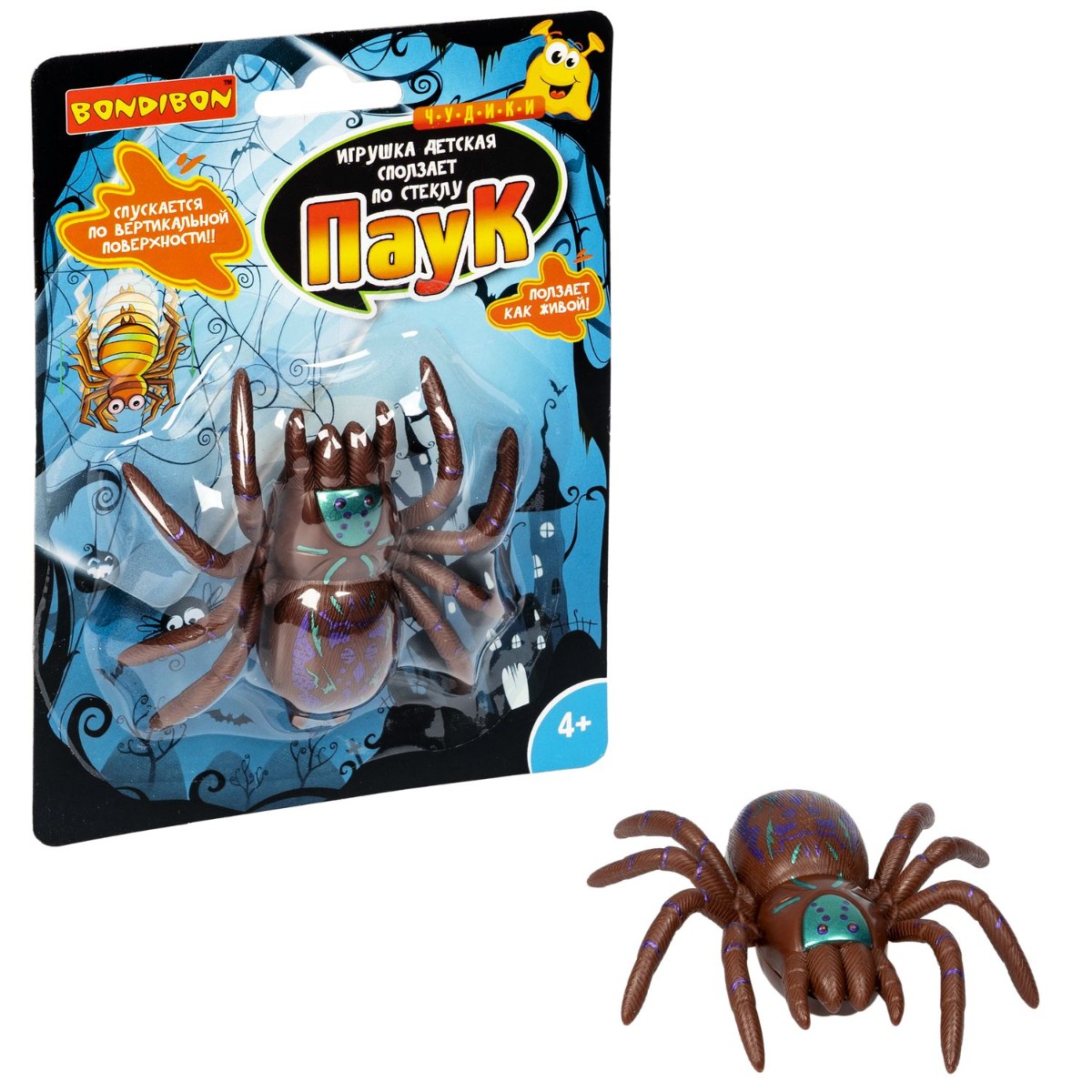 Спускается по вертикальной поверхности! В комплект входит: игрушка паук – 1 шт. Использование: поместите на стекло или любую другую гладкую вертикальную поверхность, наблюдайте как паук спускается вниз. Уход: если игрушка падает, промойте липкое колесико мыльной водой