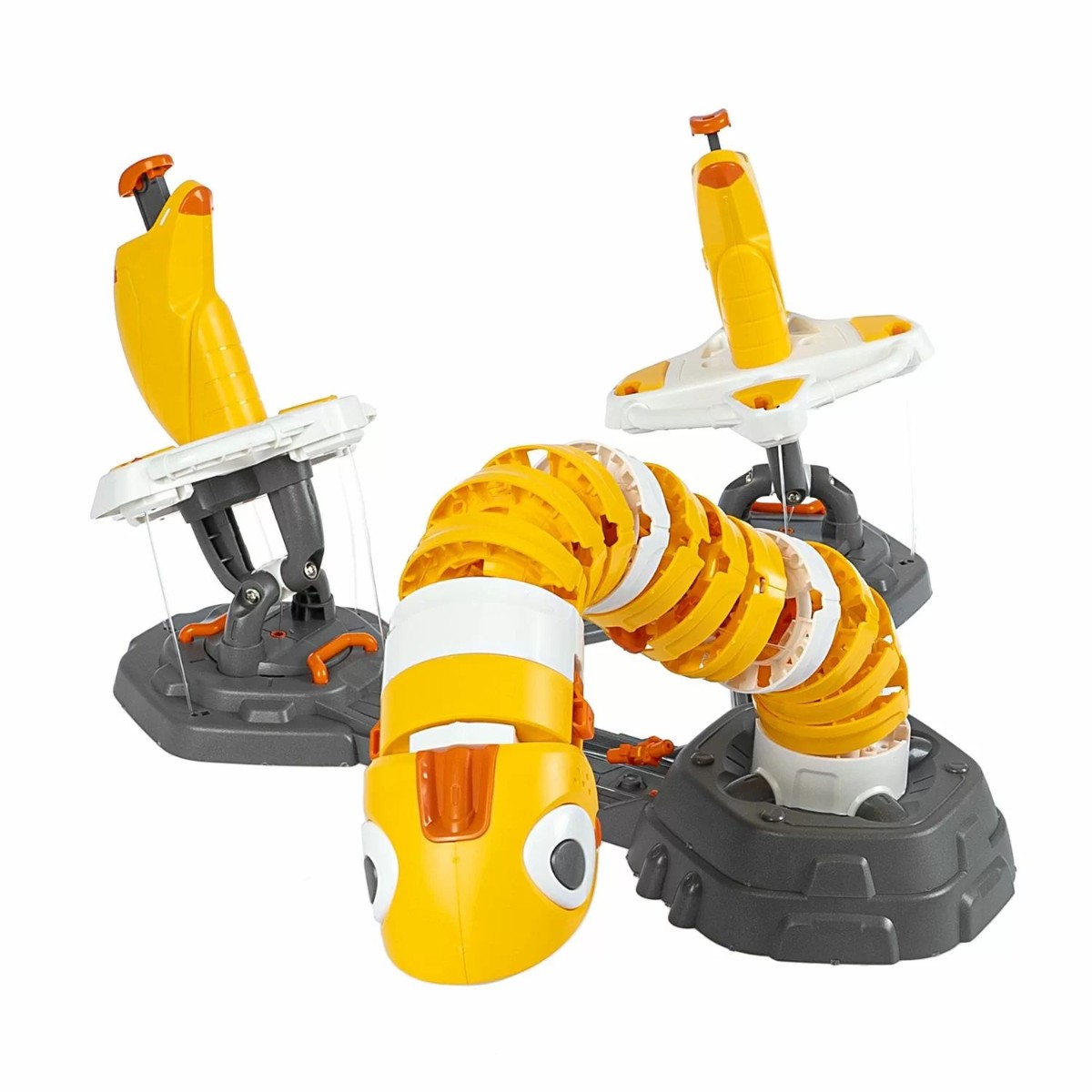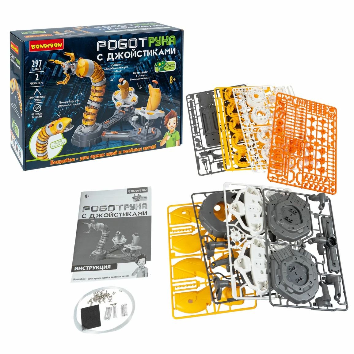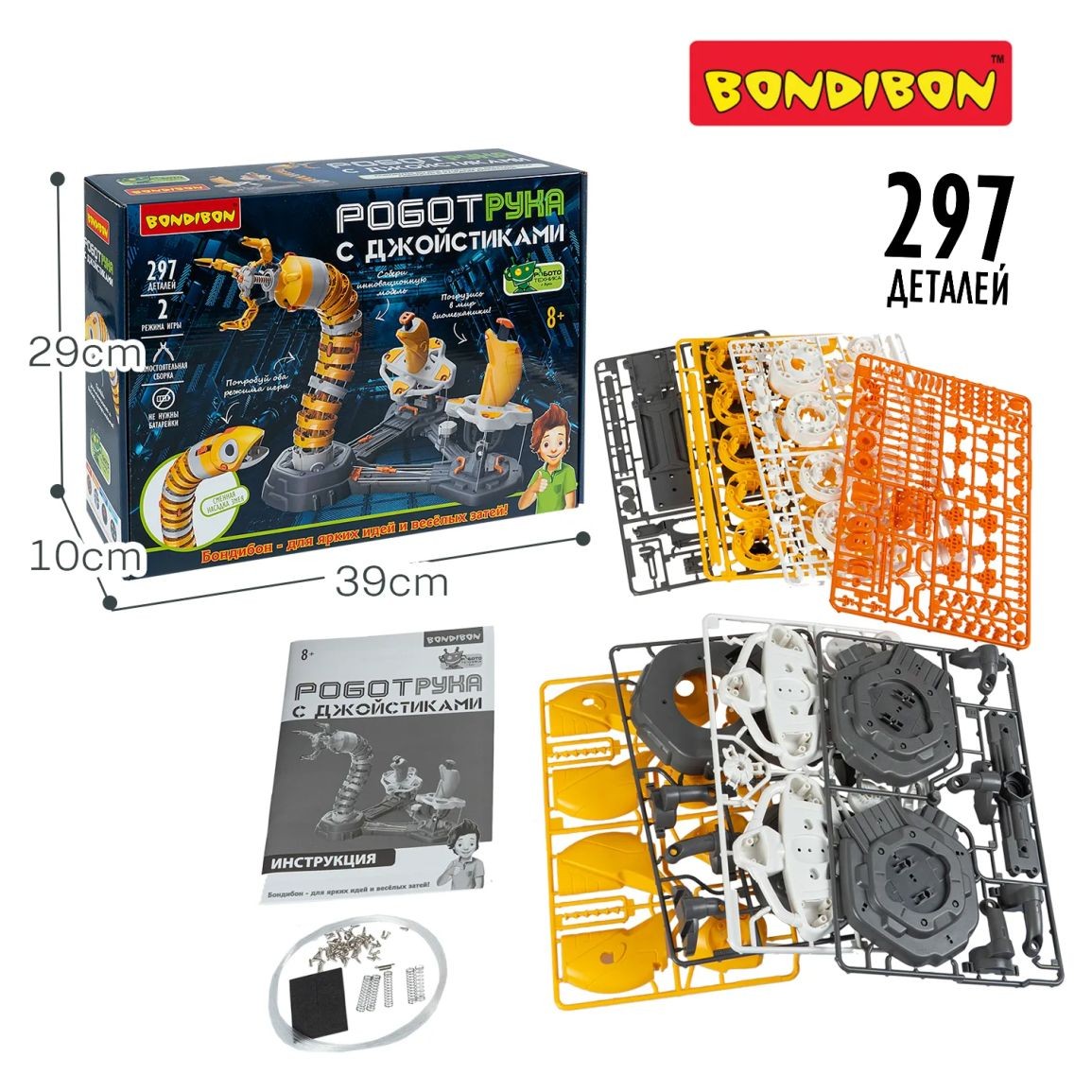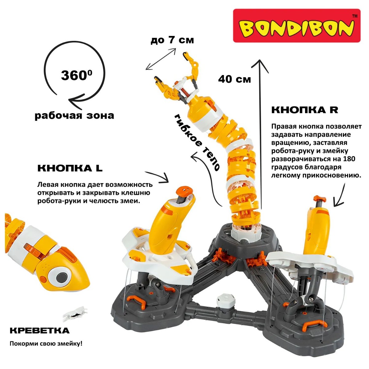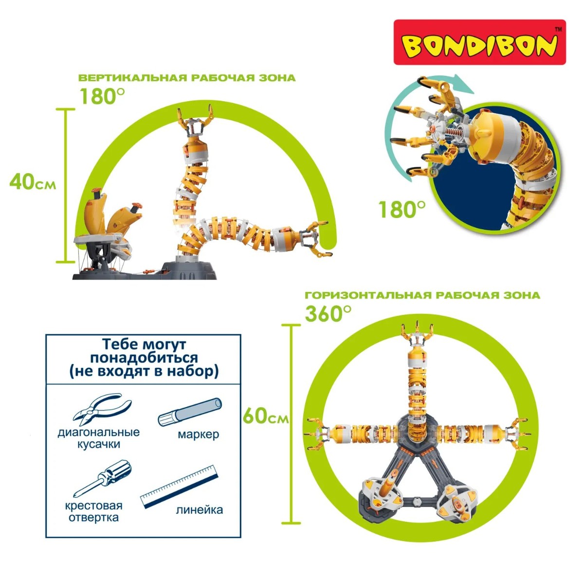 Биомеханическая техника из фантастических фильмов и мультиков теперь реальность! Набор для опытов ГИБКАЯ РОБОТ-РУКА с джойстиками и 2 режимами игры серии Робототехника с Буки от Bondibon позволяет ребенку собрать своими руками игрушку-манипулятор и управлять ее движениями, напоминающими движения животных! При помощи джойстиков Вы сможете сгибать руку под разными углами и создавать множество вариантов движений в диапазоне 360 градусов. Используйте кнопки на джойстиках для открытия, закрытия и вращения захватывающего элемента. В режиме клешня рука обходит препятствия и захватывает предметы. Режим змейка веселый и творческий. Покормите умного питомца креветкой, потанцуйте и придумайте свои сценарии игры! ГИБКАЯ РОБОТ-РУКА от Бондибон поможет детям получить интересные инженерные и конструкторские навыки, развить моторику и фантазию. В набор входят: 297 деталей, инструкция. Батарейки не требуются. Дополнительно могут понадобиться: кусачки, отвертка, маркер, рулетка или линейка. Возраст 8+