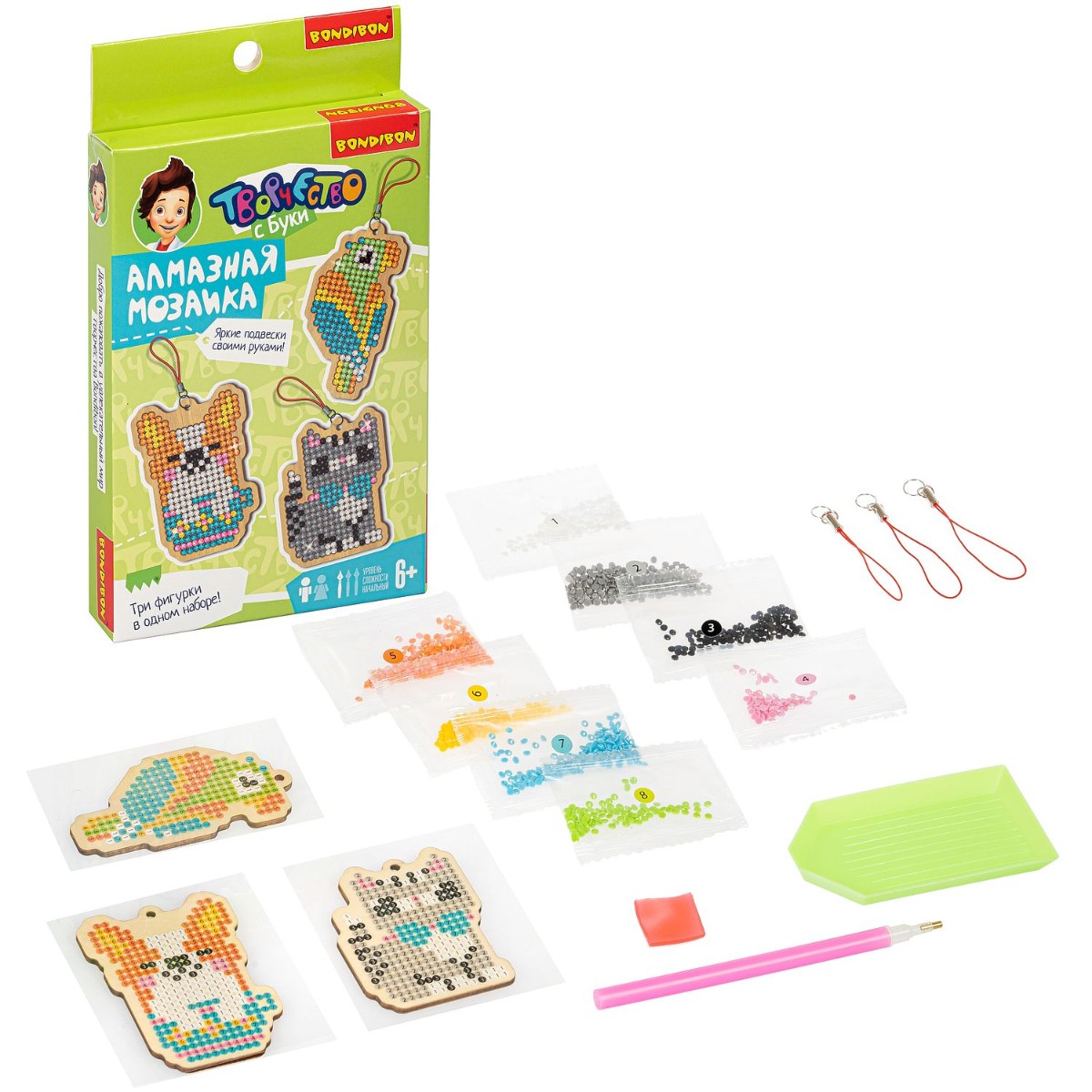 Набор для творчества Алмазная мозаика "СОБАКА, КОШКА, ПОПУГАЙ" серии Творчество c Буки от ТМ Bondibon позволяет создать 3 деревянных брелока для мальчиков, украшенных переливающимися стразами. Такой брелок, сделанный своими руками, может стать великолепным подарком родителям или друзьям или стильным украшением для ранца или ключей.