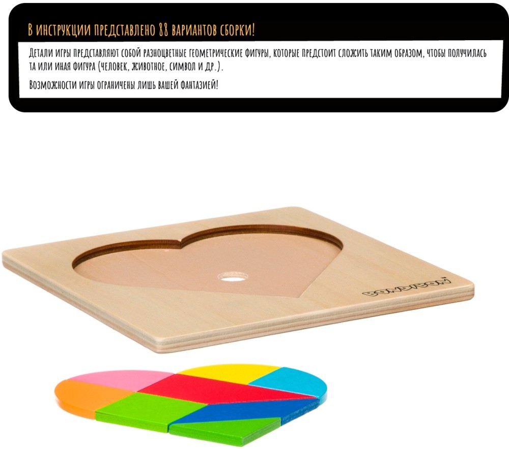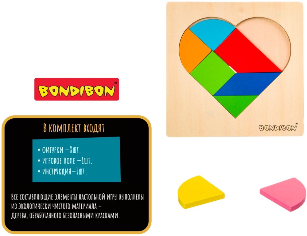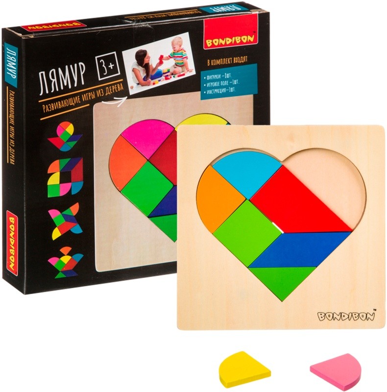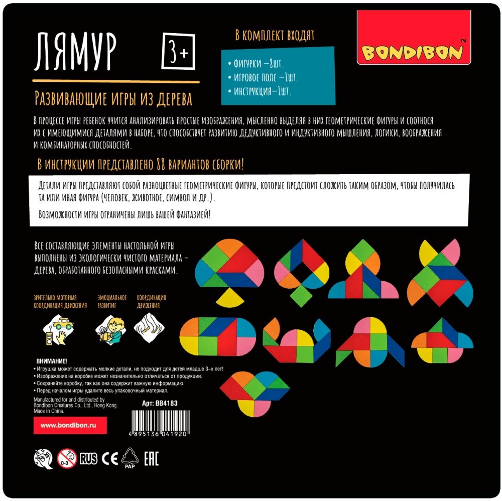 Собирай из цветных элементов красивые композиции и фигуры! Головоломка ЛЯМУР серии Развивающие игры из дерева от Bondibon предлагает 88 вариантов сборки и дает большой простор детской фантазии! Складывайте детали в виде геометрических фигур на игровом поле так, чтобы получилась одна из комбинаций, представленных в инструкции. Собирайте животных, человека, символы и многое другое! Проявите фантазию и придумайте что-то свое. Деревянная игра ЛЯМУР учит ребенка анализировать простые изображения, мысленно выделяя в них геометрические фигуры и соотнося их с имеющимися деталями в наборе, что способствует развитию дедуктивного и индуктивного мышления, логики, воображения и комбинаторных способностей. Все составляющие элементы настольной игры выполнены из экологически чистого материала – дерева, обработанного безопасными красками. В набор входят: 8 фигурок, игровое поле, инструкция. Возраст 3+ Соберите коллекцию красочных развивающих игр из дерева от Бондибон!
